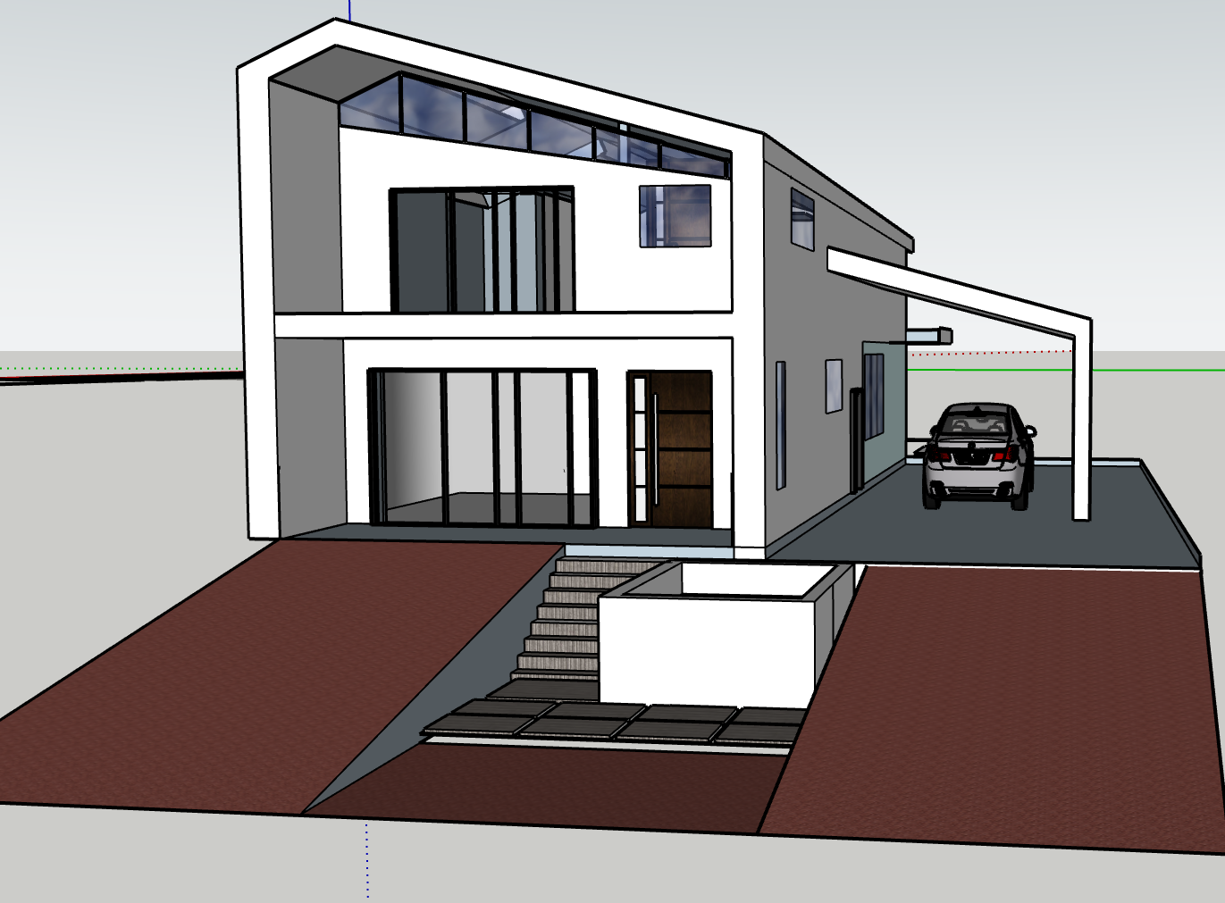 sophisticated modern minimalist house design featuring a two story building with large glass windows and a slant roof the exterior walls are smooth ivory with accents of light gray for a sophisticated clean look the front door is a rich wooden brown contrasting with sleek black window frames the carport is a stylish slate gray driveway is concrete complemented by a luxury black car the driveway is a concrete and the steps leading to the entrance are a textured light gray the atmosphere is serene and contemporary showcasing a bright and clear sky with soft natural lighting to highlight the architectural features architecture
