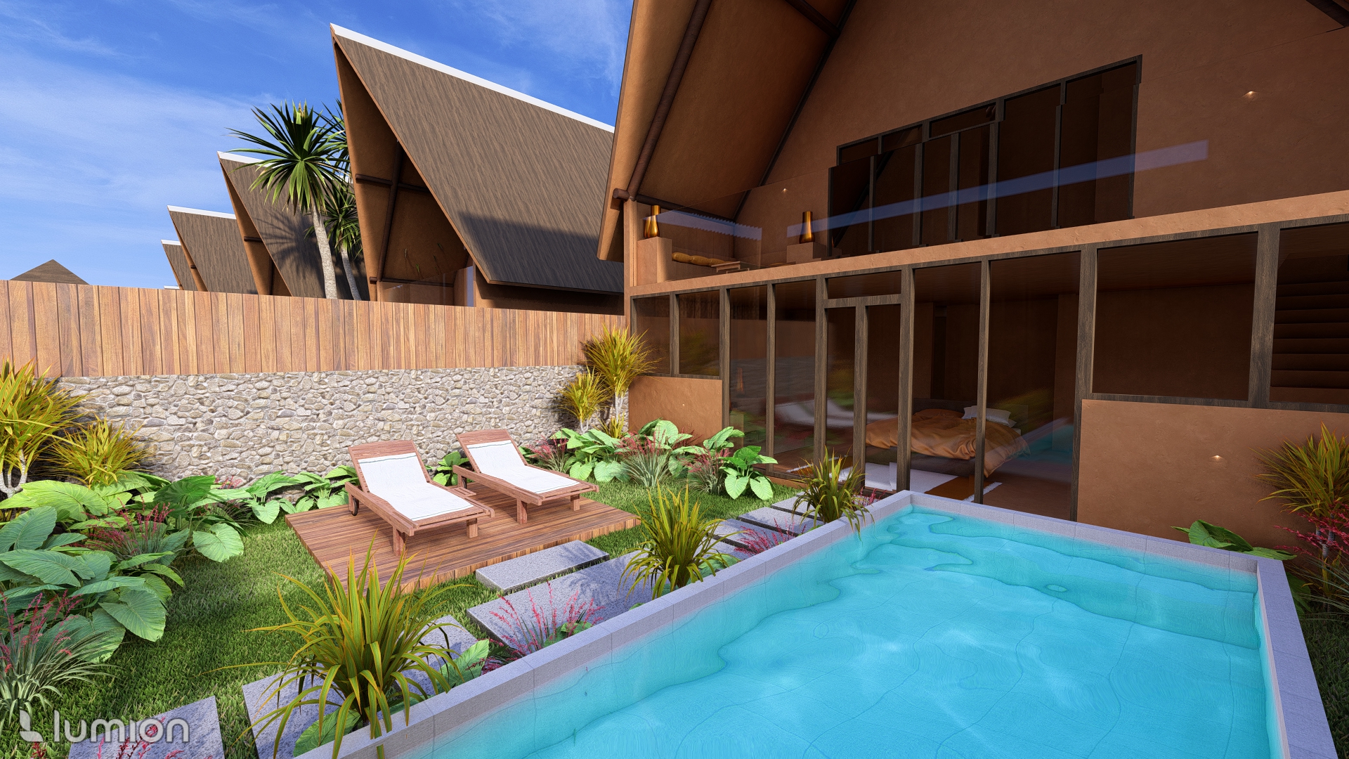i need the buildings of this render to remain accurate but to adopt the painting style and color tones of the reference image this renders needs to feel like it is in tanzania island tropical but still africa safari style