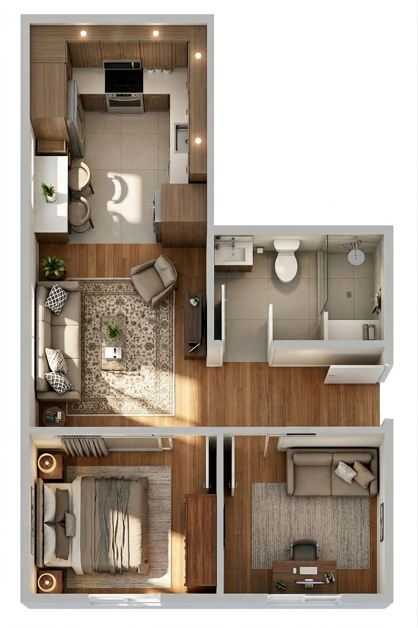 convert this floor plan into a realistic isometric 3d view of a full house show the space from an elevated angle with furniture walls and details visible keep image remove lights use the same furniture as shows on the plan do not change the orientation of the floorplan