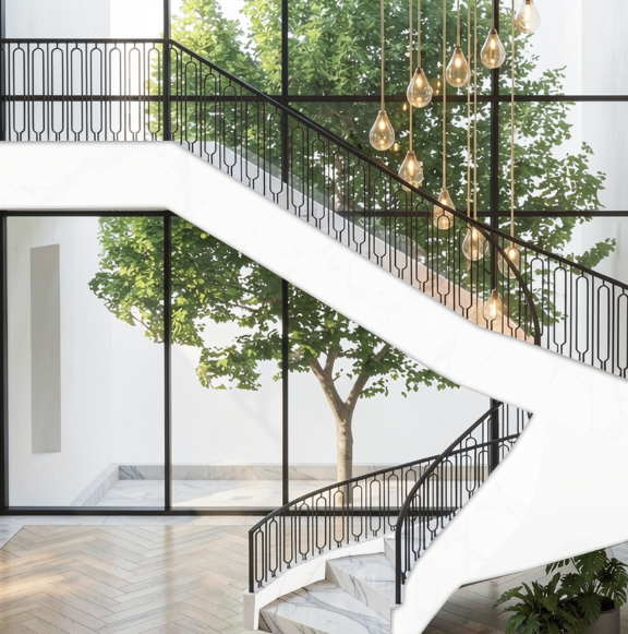 make the steps in wood very light oak modern keep the side of the staircase in white stucco make he handrail in dark bronze metal