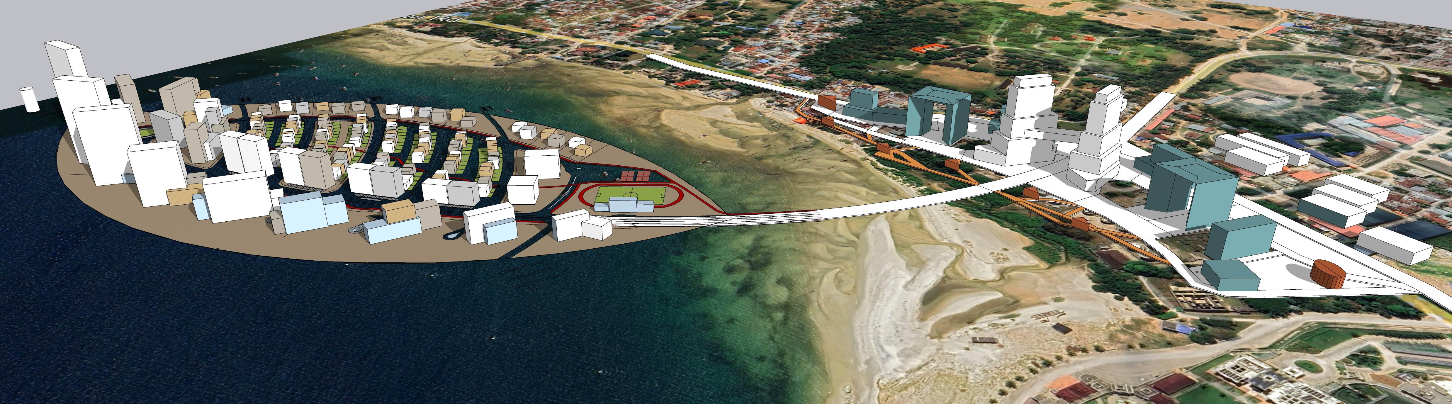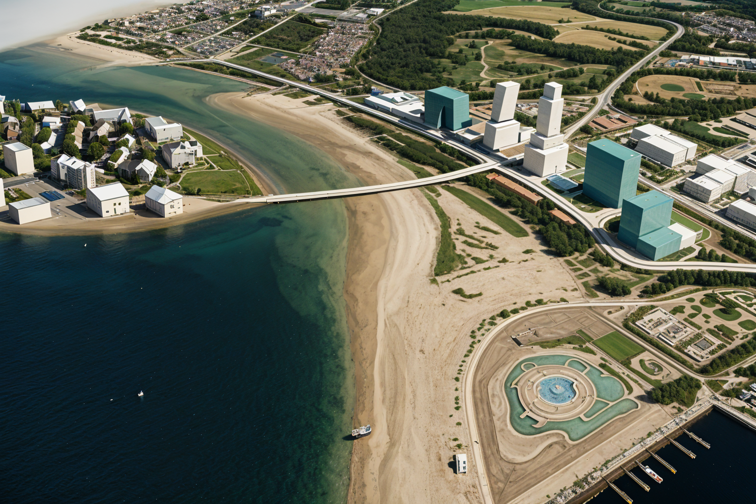 aerial shot cinematic hyper realistic tropical island city and shoreline keep the overall massing and layout but reinterpret it with modern tropical architecture add mixed use housing retail streets and sports facilities integrated into a lush coastal environment with high rise modern hotels and office buildings include dense tropical vegetation palms flowering trees coastal plants and layered greenery add detailed street furniture such as benches shading structures planters bike racks lighting and wayfinding populate the scene with diverse people walking shopping exercising and relaxing use warm natural light soft atmospheric haze and a high end filmic look
