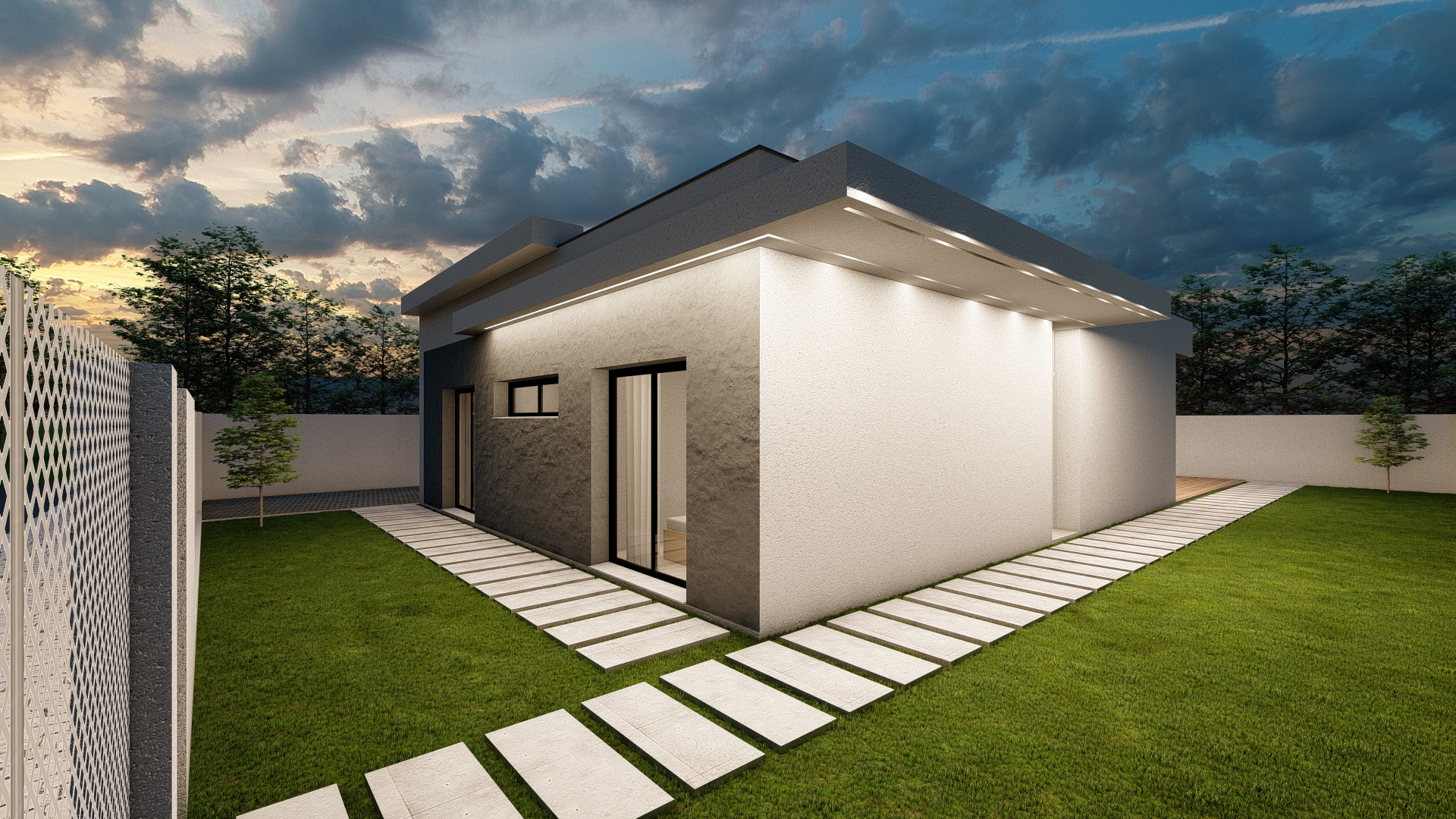 ilumin o natural do sol com sombras das arvores refletido na fachada da casa relva verde no chao com lajetas de passadeira fachada branca com grandes v os de janela casa inserida no meio urbano com background com casa com estilo mediterraneo