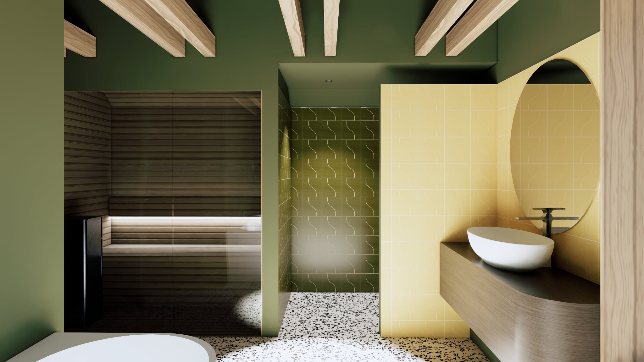 render a modern bathroom interior with a soothing minimalist atmosphere use a deep forest green for the walls and ceiling complemented by natural wood beams on the ceiling to enhance warmth incorporate a smooth white ceramic sink and a sleek wooden vanity the left side should feature a cozy wood paneled sauna with a warm glow install vibrant yellow tiles behind a circular mirror for a touch of brightness and cover the floor with a terrazzo pattern in black and white for a contemporary feel emphasize natural light and subtle shadows for an inviting and tranquil ambiance