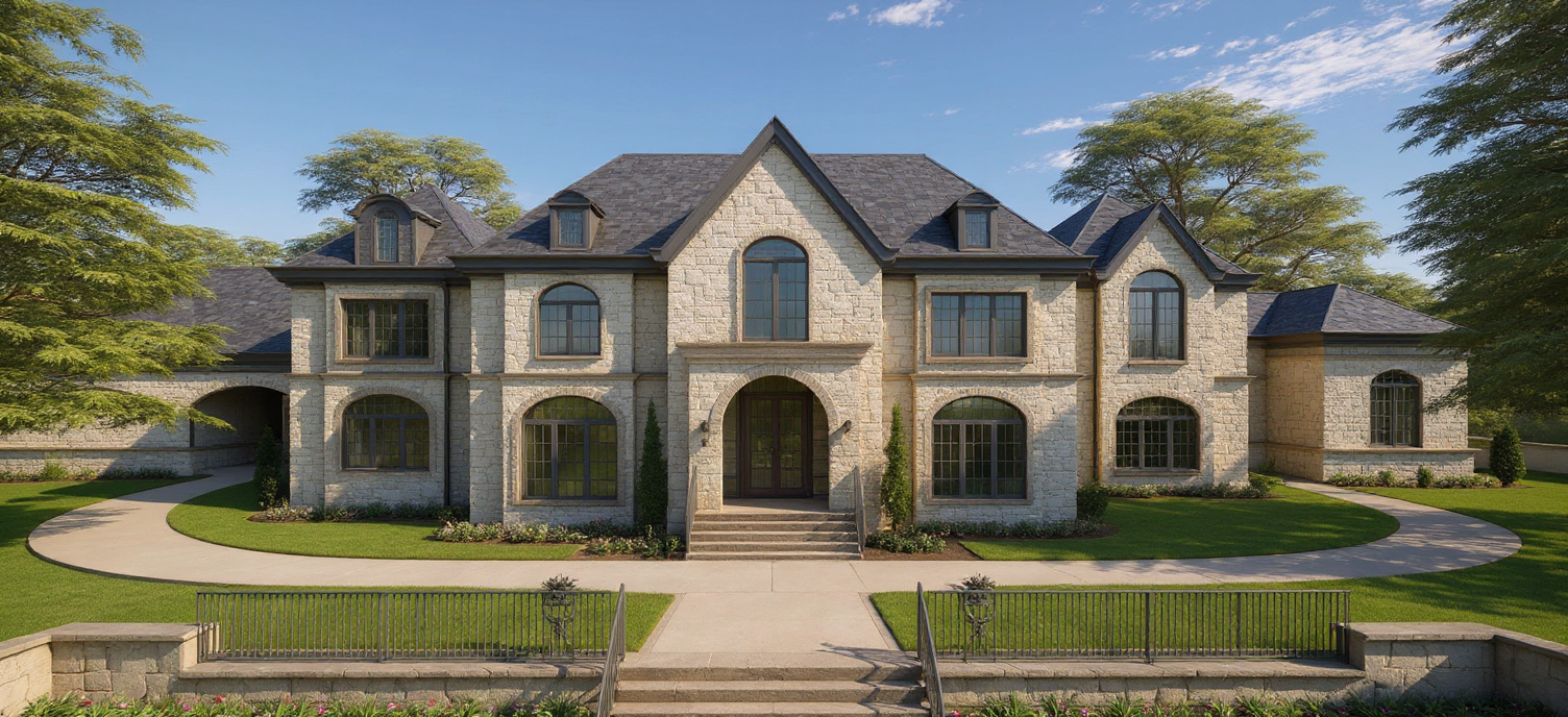 white stone walls dark slate roof charcoal gray steel windows charcoal gray roof trim smooth white limestone trim around windows limestone arched opening at entry vestibule and stairs arched front door and sidelights add lush landscaping bushes and flowers in front of house add oak trees behind house