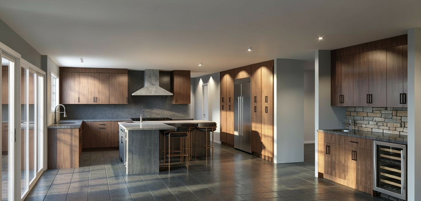 remove the lights above the fridge wall make all of the backsplashes the same concrete material