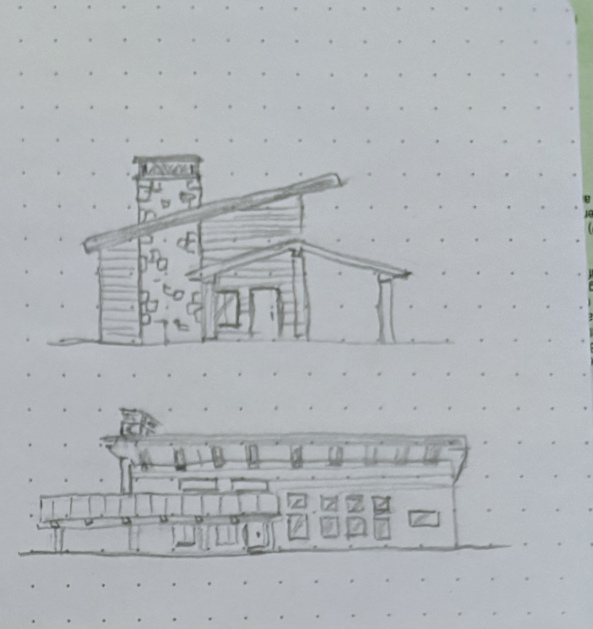 a modern rustic house in a natural setting the upper house has a tall stone chimney with shades of gray and beige and wooden paneling in natural cedar brown the roof is slanted covered in dark gray shingles create a cozy entrance with a small porch the lower house has a long flat roof in charcoal gray large windows and a wooden facade in a mix of light oak and taupe add a spacious deck in weathered gray wood the atmosphere is serene and inviting with a soft warm glow from the setting sun casting gentle shadows and highlighting the natural textures surround with lush greenery and a clear blue sky