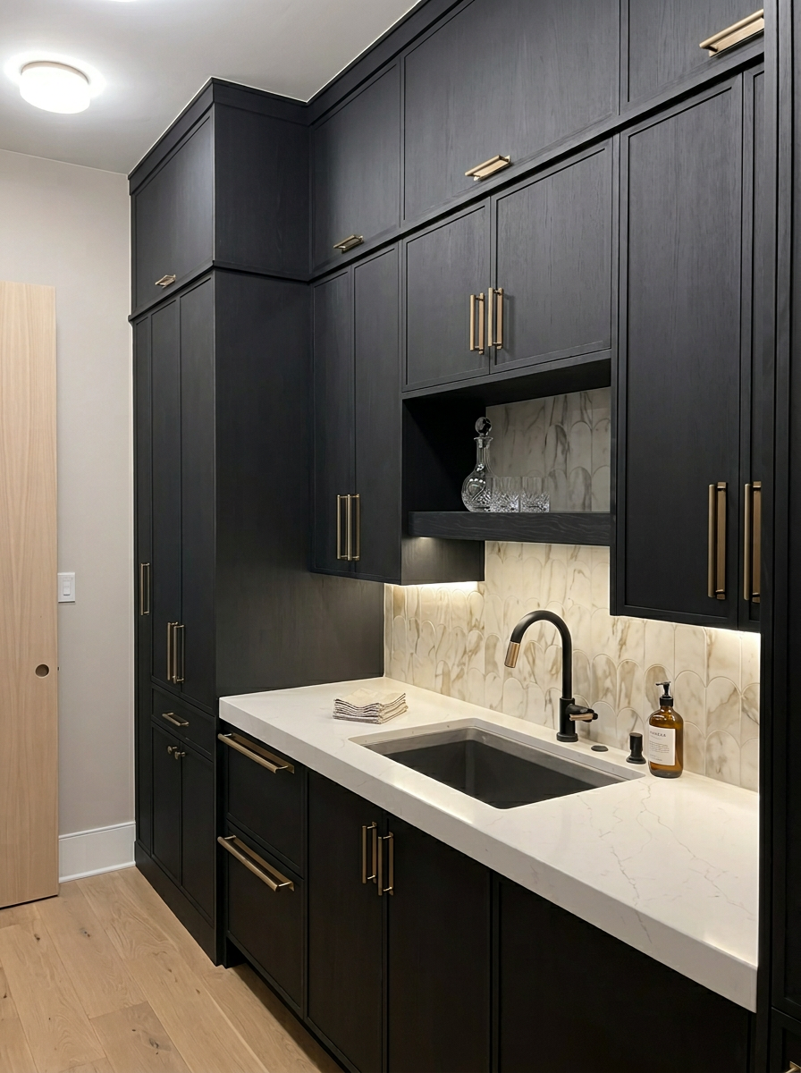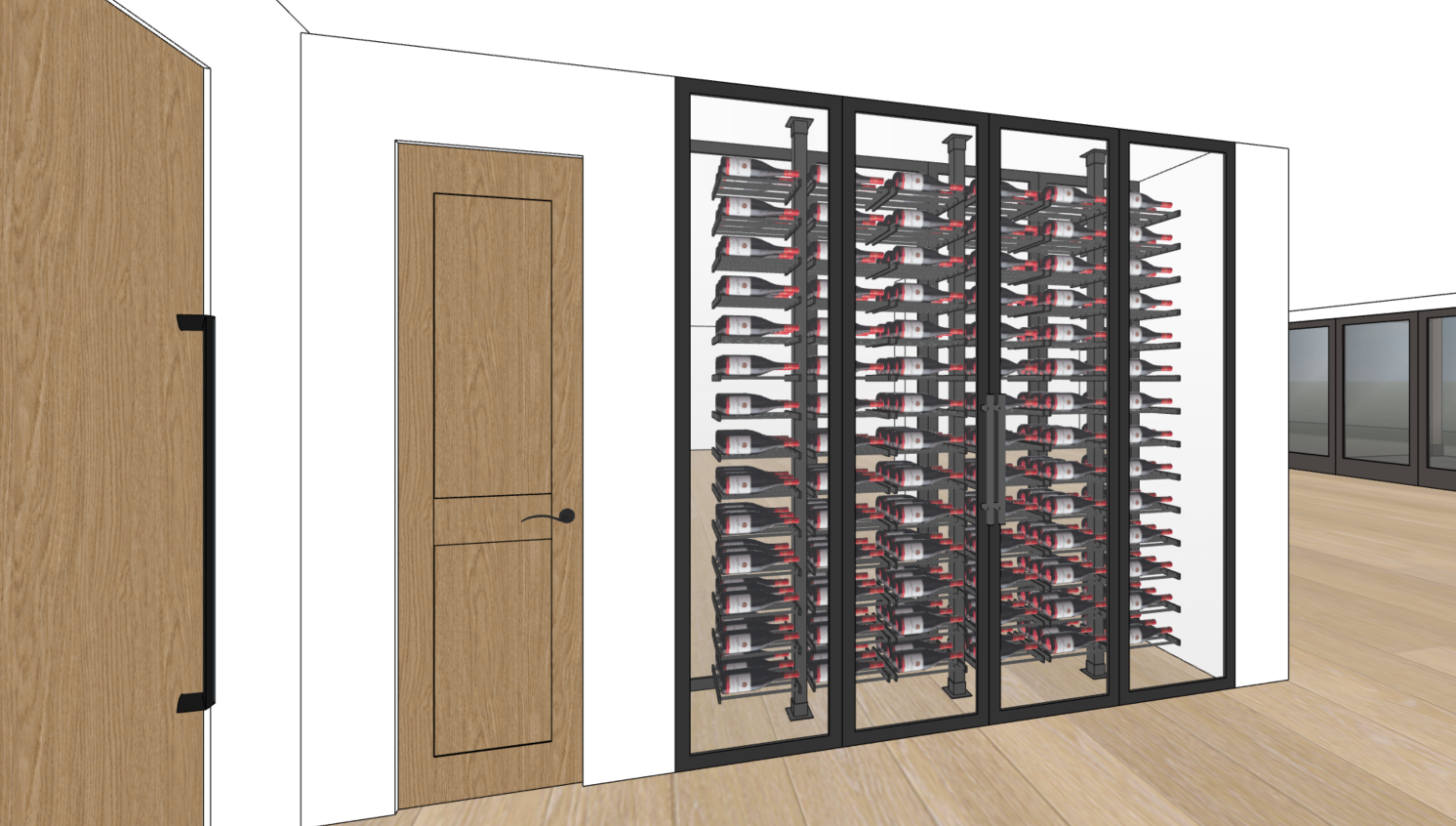 a modern wine cellar featuring a sleek glass enclosure with black frames showcasing well organized wine bottles on dark metal rails there are four dark framed glass panels with two long dark metal handles side by side in the middle flanked by stationary glass panels on either side of the doors the floor is a medium toned hardwood enhancing the rustic elegance bright clean white walls contrast with the darker elements creating a sophisticated yet inviting atmosphere the overall mood is refined and contemporary with a focus on the stylish display of the wine collection outside the windows is a patio and pool with mountain landscape in the backdrop