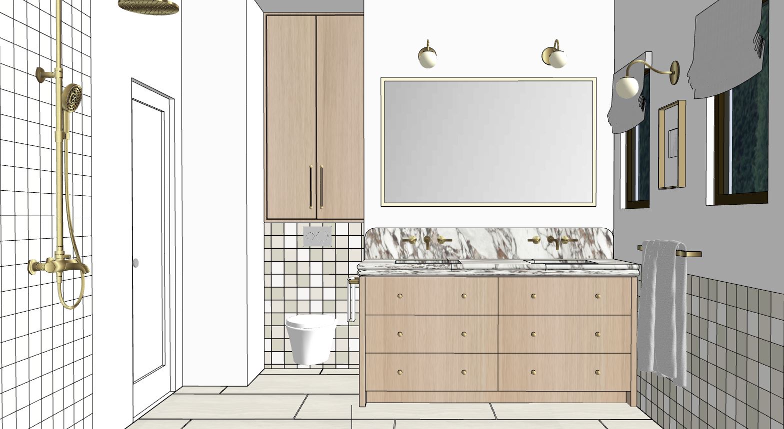 create a photorealistic rendering of this bathroom with soft warm indirect lighting