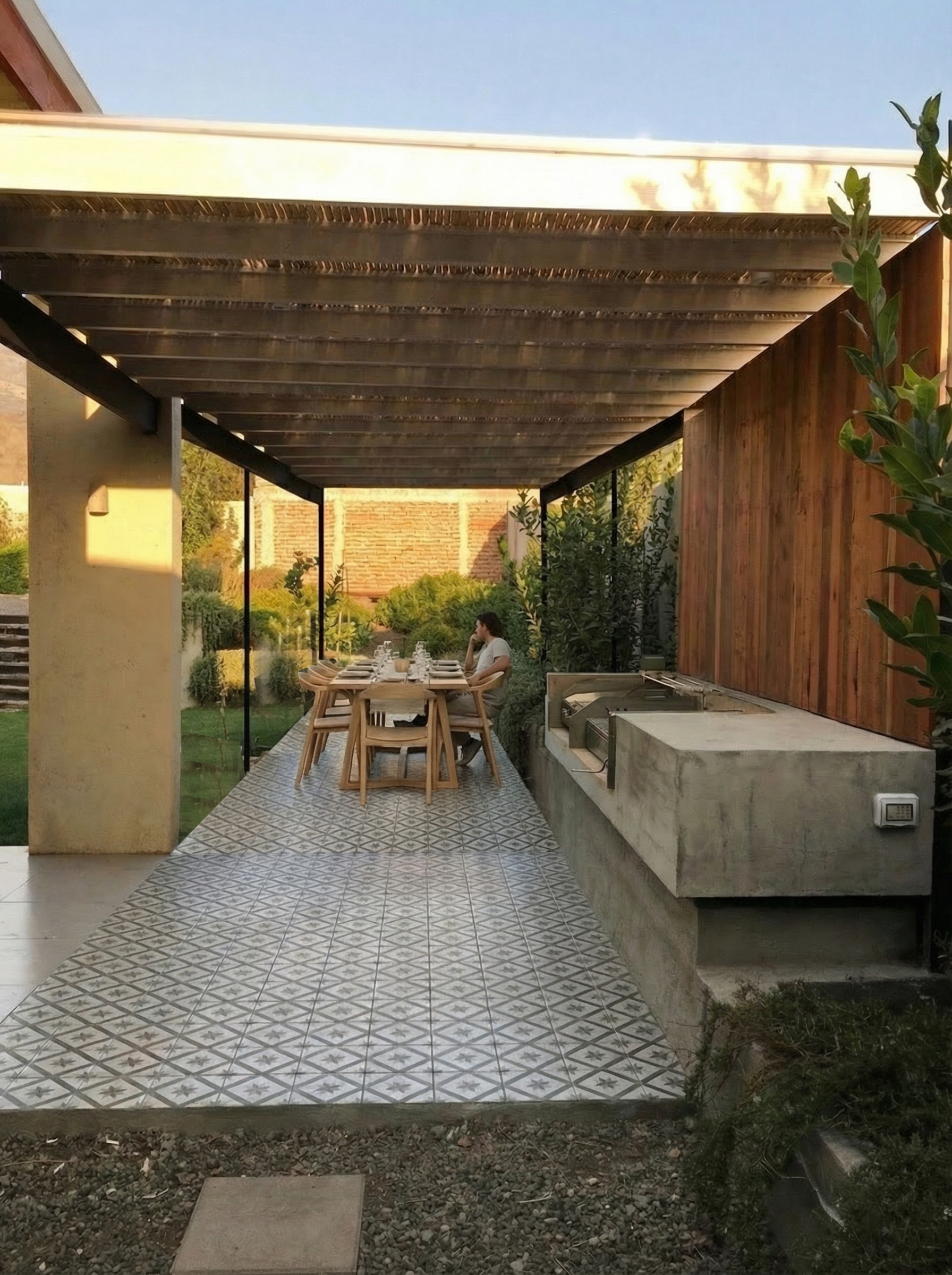move the dining table further toward the back of the pavement improve overall lighting brighter warmer and more visually appealing increase image clarity and definition correct perspective ensure straight vertical lines architectural photography style
