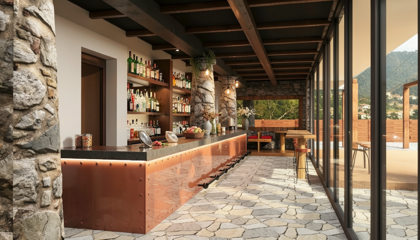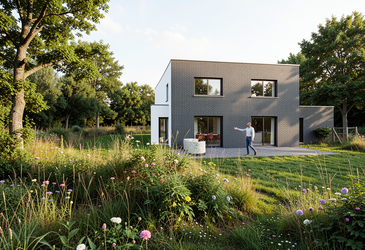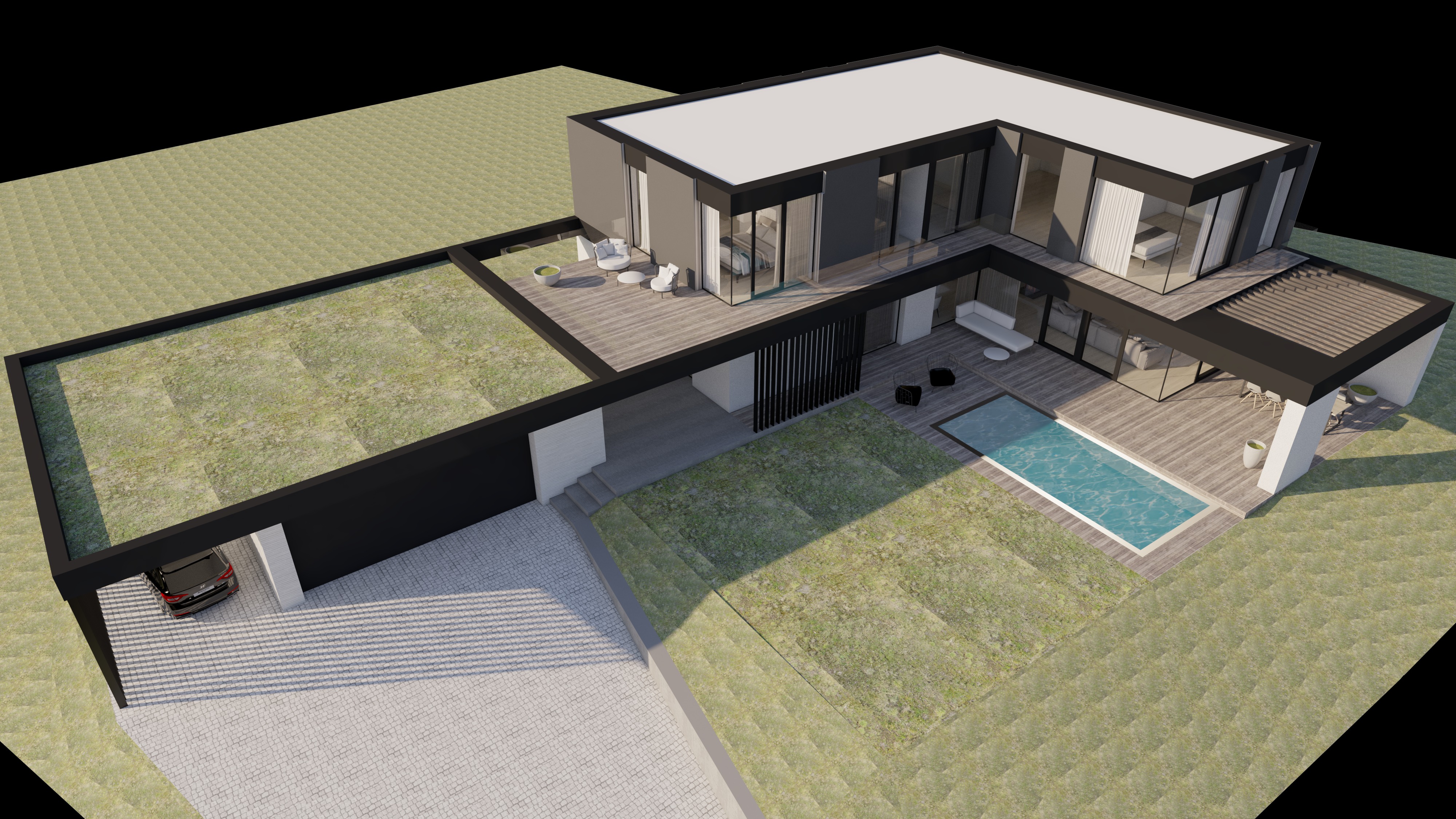 precise photorealistic visualization of the exterior of a residential house keep all materials and do not change them glass railings garden grass and trees gray black parts sheet metal windows glass flat roof covered with low vegetation