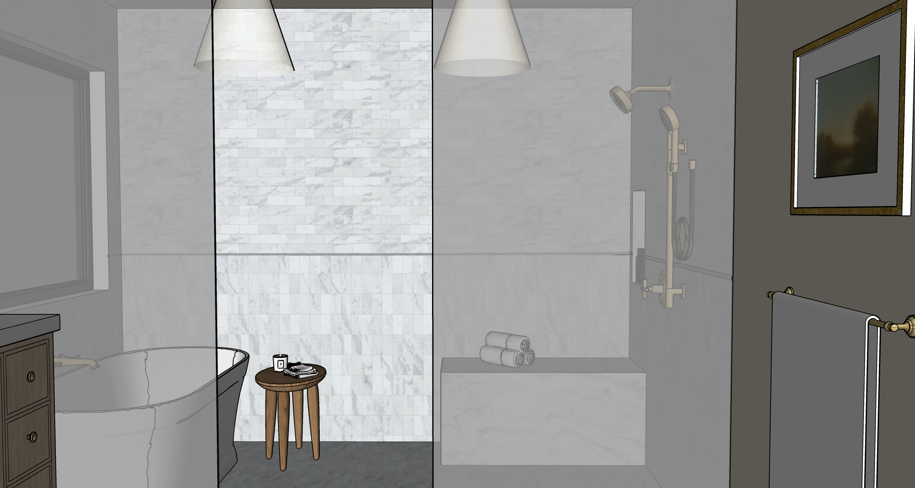 interior shot a transitional mountain bathroom design darker slate limestone flooring complements a light oak wood grained vanity and a cabinet with antiqued brass knobs a glass shower enclosure with elegant brass fittings completes the design the atmosphere is calm and relaxing the lighting is soft and natural creating a relaxing spa like atmosphere the mirror is wood framed the fixtures are brushed dark brass the mirror reflects the smooth frameless white door