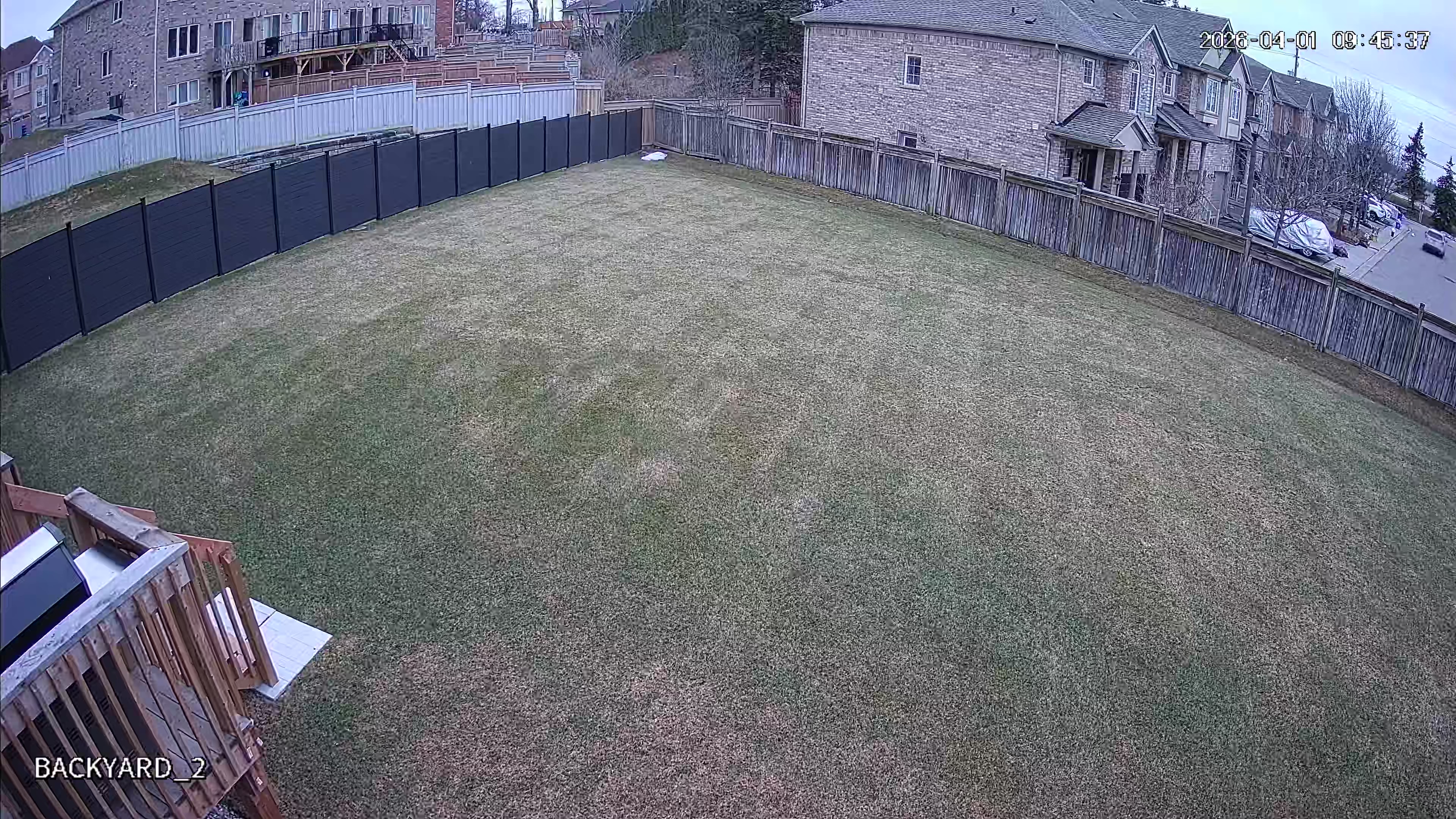 a serene backyard with a lush vibrant green lawn surrounded by a combination of rustic wooden and sleek black fences the houses are made of warm toned brick with charming architecture the morning sky is a soft blue with hints of pastel colors creating a calm and inviting atmosphere add subtle gentle sunlight casting soft shadows across the scene enhancing the tranquil and peaceful setting create privacy using trees like cedars and river birch