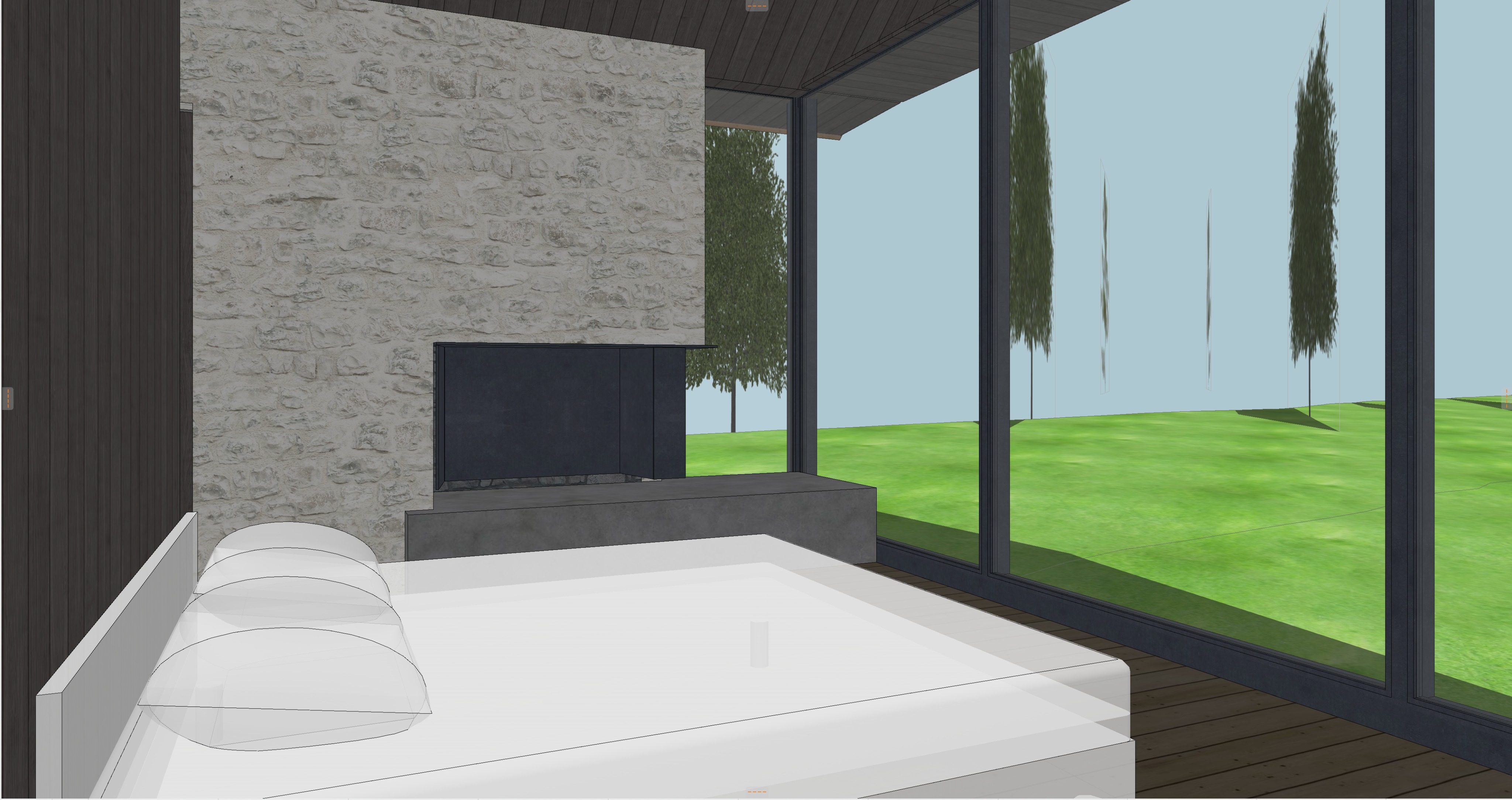 add fire in fireplace add trees outside