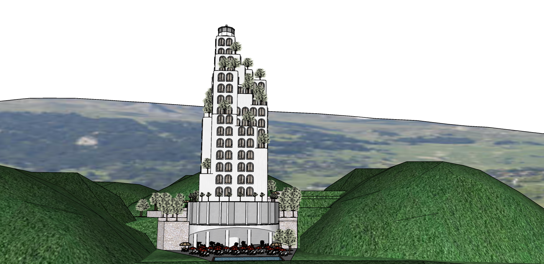 towering modern skyscraper amidst lush green hills with a complex structure made light grey concrete walls the building sports a unique geometric design with terraces adorned with greenery the surrounding hills are a vibrant green providing a serene backdrop a crystal clear pool reflects the bright blue sky earthy tones are present in the scattered trees and the subtle pathways atmosphere is peaceful and harmonious conveying a sense of futuristic urban living blended with nature please fill the surrounding hills with olive trees and some houses make it an elite residential zone