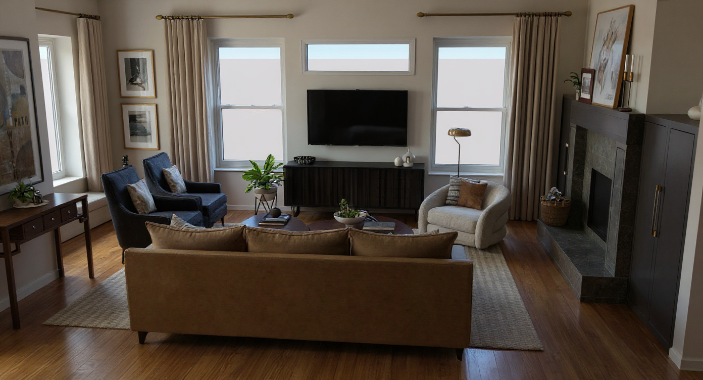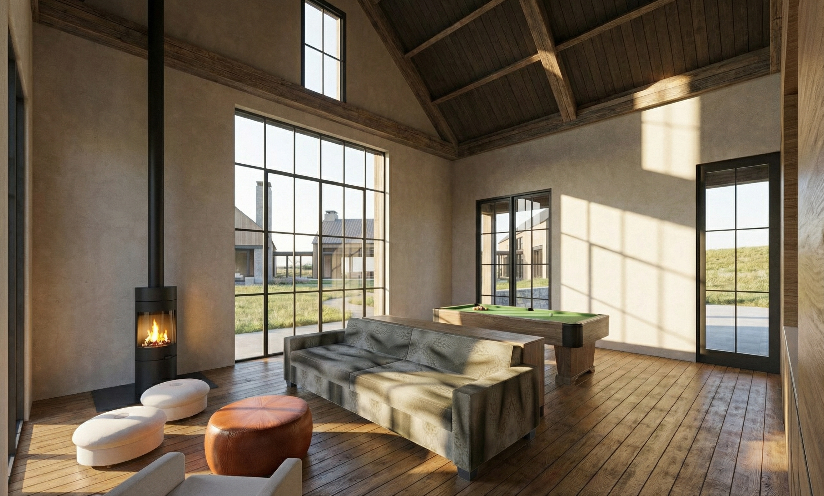 dynamic building lighting dusk corten steel and concrete panels tall grass foreground