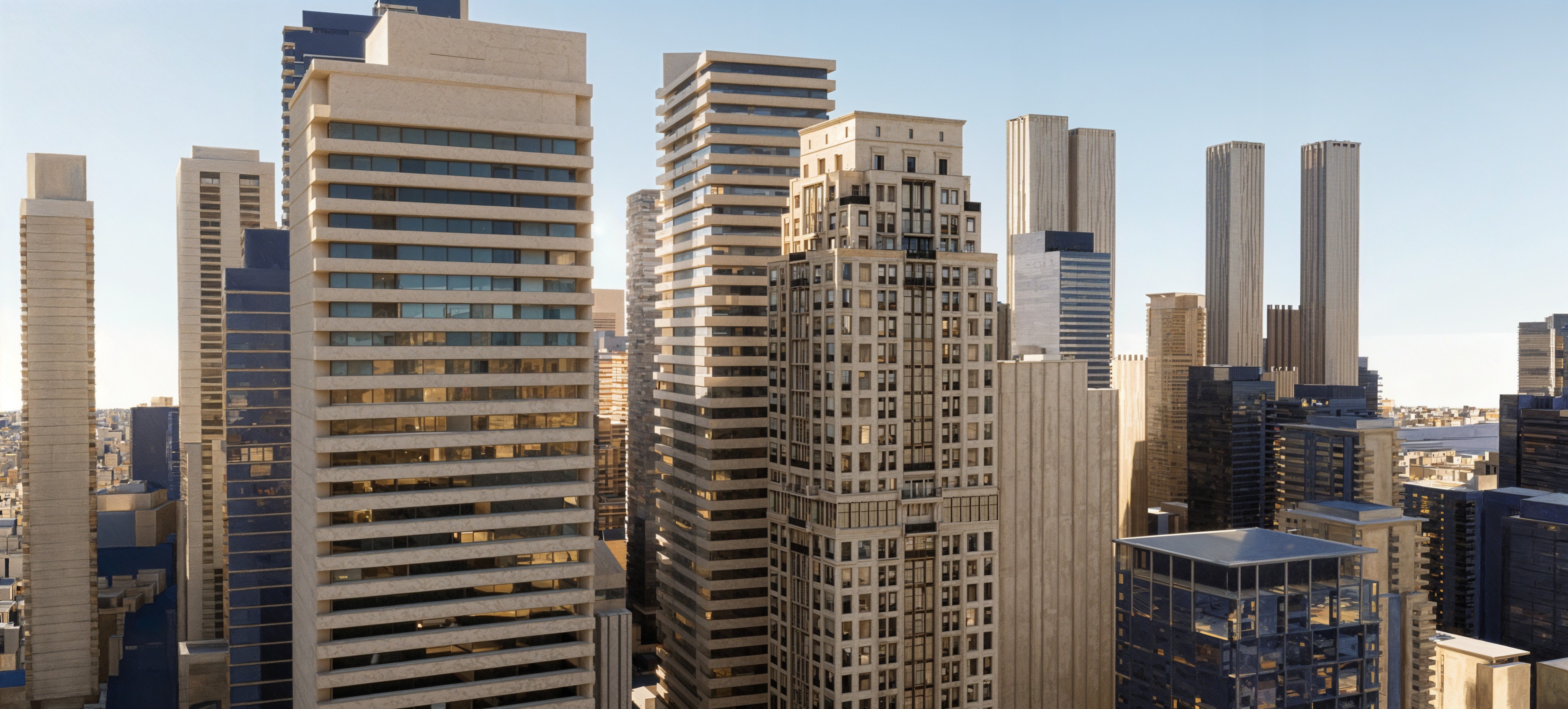 create a highly realistic image with real limestone and glass materials on the middle tower