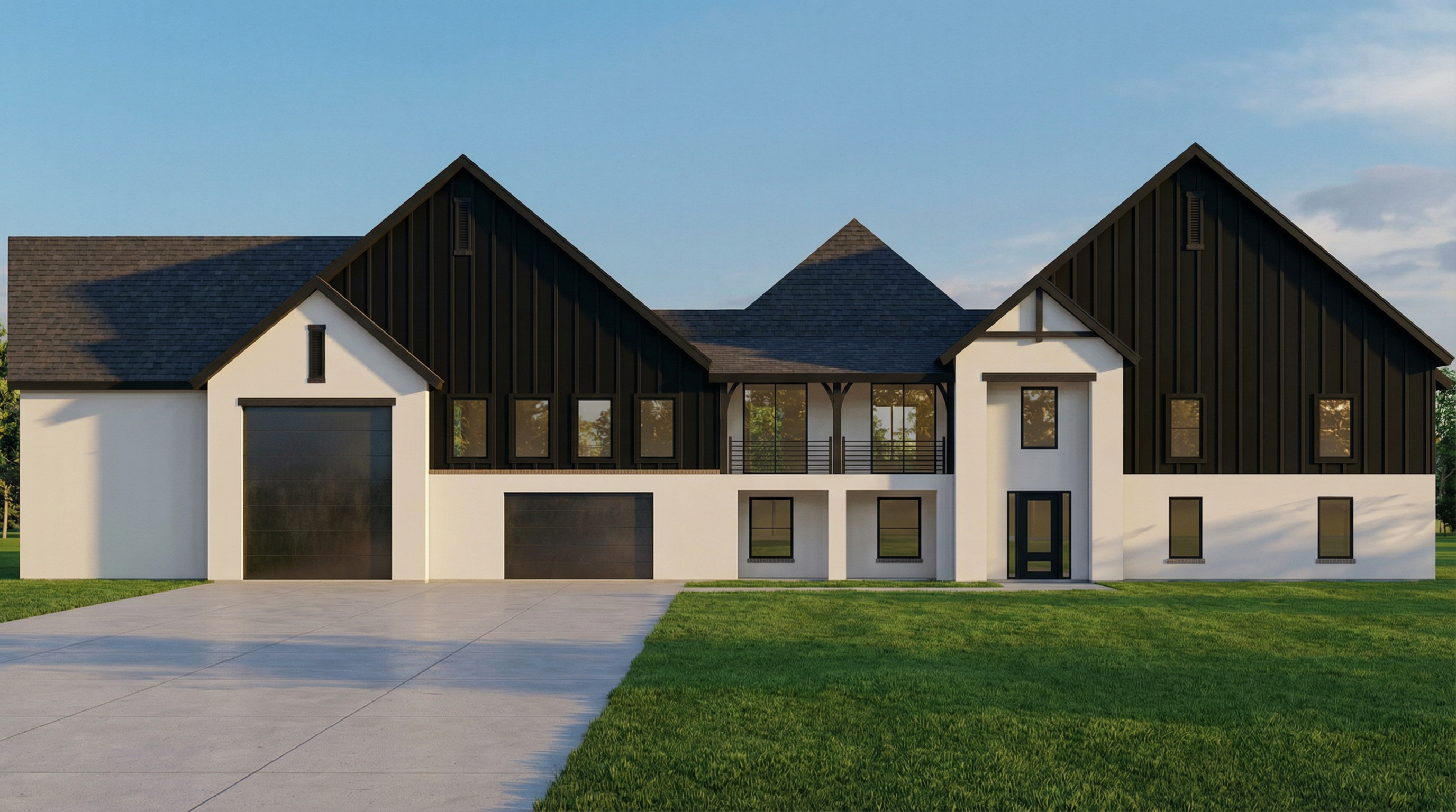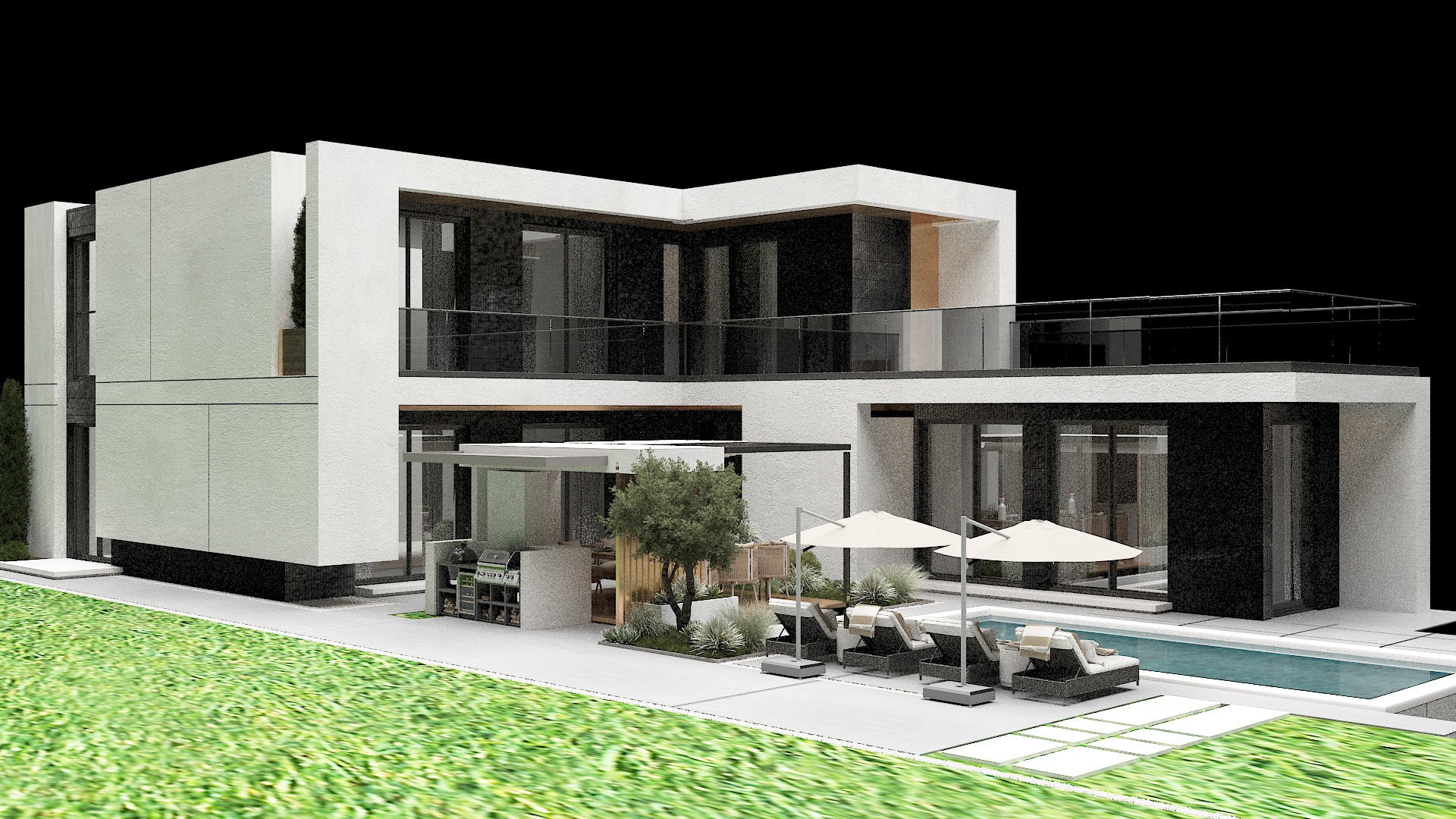 create hyper realistic rendering on this contemporary house with exposed concrete in white as well as grey black elements on the facade large glass minimalist windows and put all the wooden elements in the picture in an inconspicuous wood decor make the grass hyper realistic as well as the gray tiles in the yard the water in the pool to laze gently in the sun and a realistic picture of water in the pool itself golden hour lighting with warm light soft shadows realistic reflections make the background so that the house is located in an isolated wooded area do not change any elemet in the image do not change colours and do not add other elements