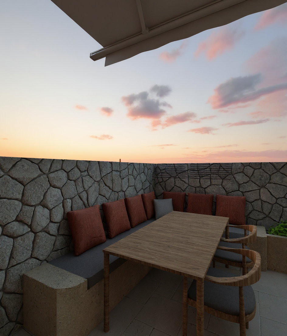 create a hyper realistic afternoon render of the exact building design shown in my drawing do not change any architectural details proportions or composition the structure is a single story modern home with a flat roof clean geometric lines and a combination of concrete beige tile and dark cladding keep the same layout windows and entrance placement use cinematic bright afternoon lighting with a soft blue sky with reflection on the windows highlight material textures realistically smooth concrete walls dark trim subtle reflections on glass and natural light shadows on the ground tiles include a faint lawn area with soft lighting gentle reflections and ambient shadows for realism the mood should be calm modern and photographic a magazine quality image that looks true to the original drawing just brought to life with realistic depth lighting and texture bright afternoon sunlight a car on the arport and people walking