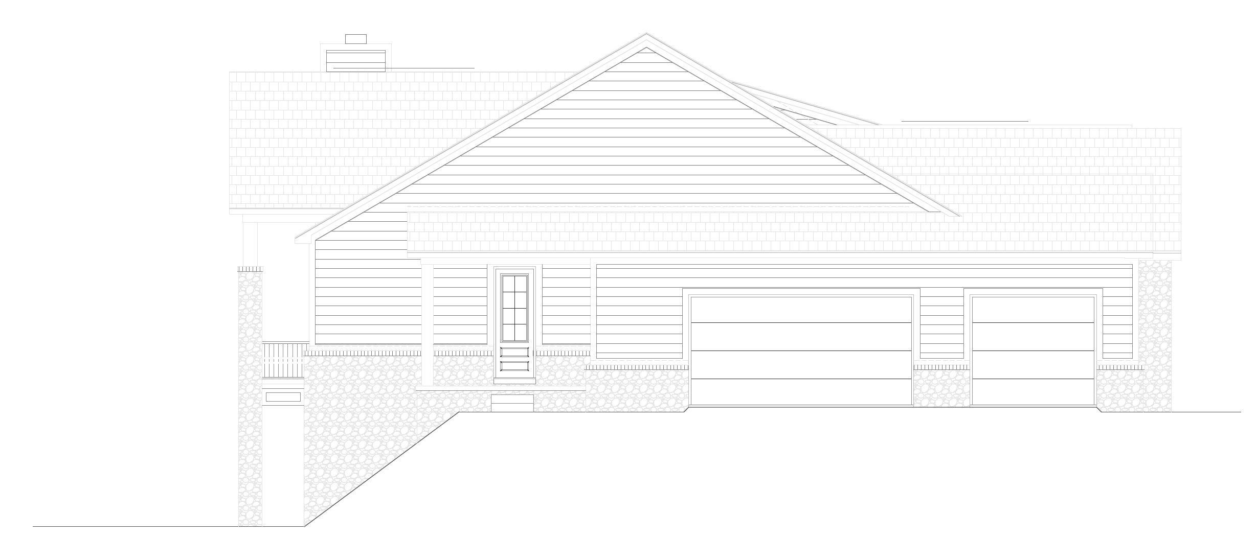 render this elevation linework in the same visual style matching clean architectural illustration soft neutral color palette whites grays muted greens natural stone tones subtle hand drawn line accents light watercolor shading consistent shadow softness direction crisp but warm presentation quality no perspective flat orthographic elevation consistent landscape style rounded shrubs white flowering plants clustered soft greens small trees at edges same vignette fade at the ground line same roof texture material rendering and line weight do not redesign the architecture maintain exact proportions and geometry from the uploaded linework drawing goal produce a rendering that looks like part of the same cohesive set as the reference elevation identical artistic treatment color logic materials shadows and landscaping style black garage doors warm stained cedar pillars carriage lights on either side of garage doors black metal roof over large garage door black front door black dimensional asphalt shingle roof with black metal seem roof over porch rough sawn cedar in a warm stain at porch post black framed windows with black muttons eldorado cliffstone in color boardwalk for the base of the home