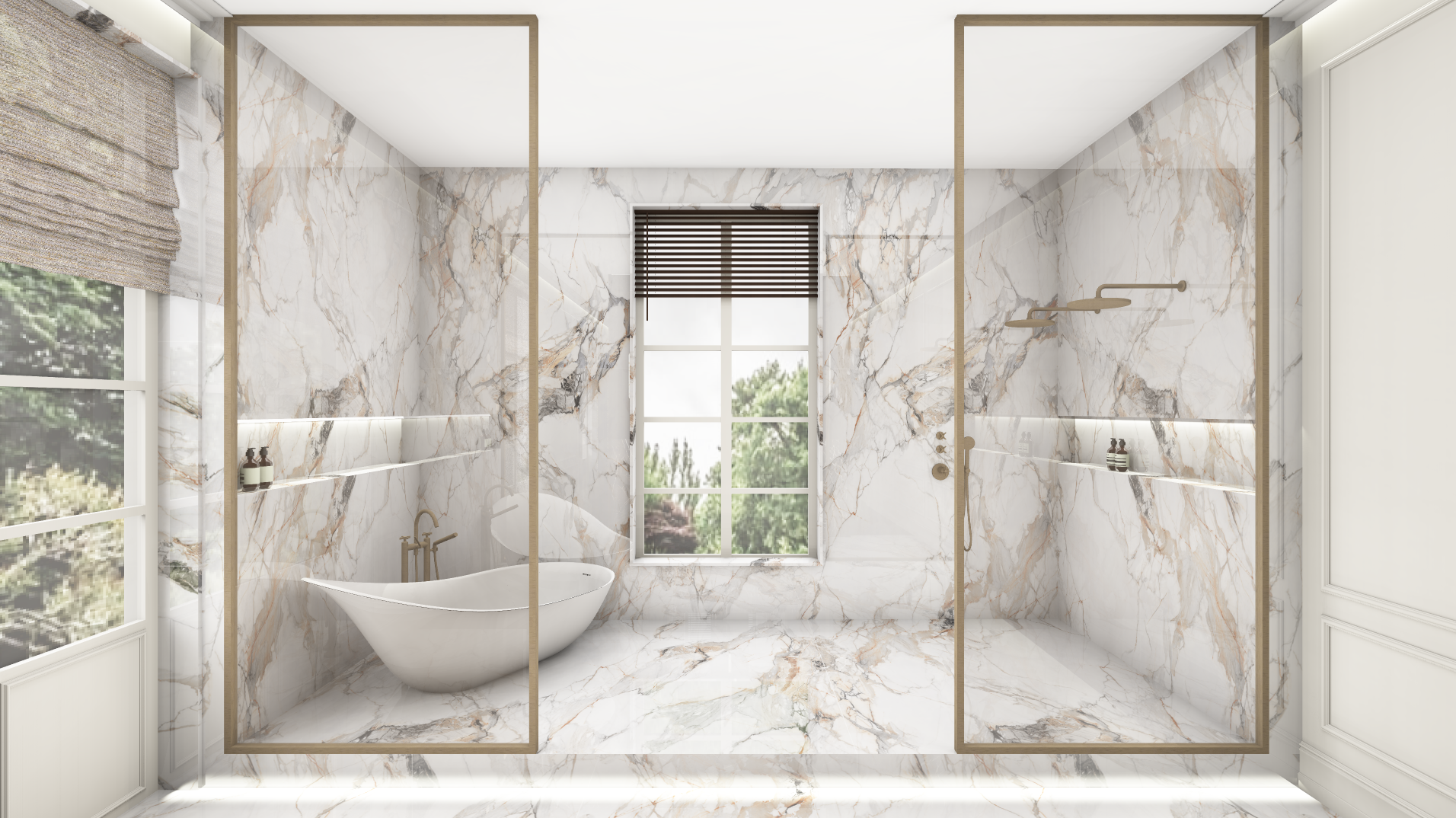 transform this image into an ultra realistic 3d photorealistic render preserve the exact original perspective camera angle proportions composition and geometry without any distortion or structural changes refine and enhance all materials to a high end interior standard using physically accurate pbr textures materials may be improved in quality and realism but must remain consistent with their original intent and placement do not introduce unrealistic or unrelated materials replace the floor with light natural stone elegant and refined with a soft subtle gloss finish the stone should have a calm minimal appearance with delicate and understated veining or texture no heavy patterns or strong contrasts create a warm hotel chic atmosphere with a refined and upscale look use a harmonious palette of warm neutrals beige champagne soft browns rich tones and elegant finishes apply soft balanced lighting with reduced contrast avoid harsh highlights and deep shadows use gentle transitions between light and shadow soft ambient illumination and a warm color temperature to create a calm and luxurious mood use a professional full frame camera look with realistic depth of field accurate exposure and soft tonal range no harsh contrast maintain clean flawless surfaces no dust no scratches no damage ensure a high resolution sharp output 8k quality with lifelike colors and a premium interior design feel do not redesign the space only enhance material quality and atmosphere no stylization or artistic reinterpretation less reflection in the glass wall