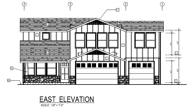 refine this north elevation to match the approved east front elevation style and materials keep all rooflines windows doors siding layout trim and structure exactly as rendered do not alter architecture in any way apply identical modern coastal farmhouse exterior palette soft warm white board and batten siding light natural oak wood accents at gables and trim matte black window frames subtle gray stacked stone base where present dark gray asphalt shingle roof front yard landscaping per reference three single stalk juvenile king palms evenly spaced along front yard each palm with a clean circular white decorative rock ring at base one juvenile sago palm placed at the northeast corner near the property line at row minimal drought tolerant planting and simple turf areas replace driveway with alternating dark gray concrete pavers in a subtle blended pattern maintain clean southern california residential curb appeal neutral daylight lighting realistic residential render ensure elevation proportions and architectural details remain identical to original north elevation drawing