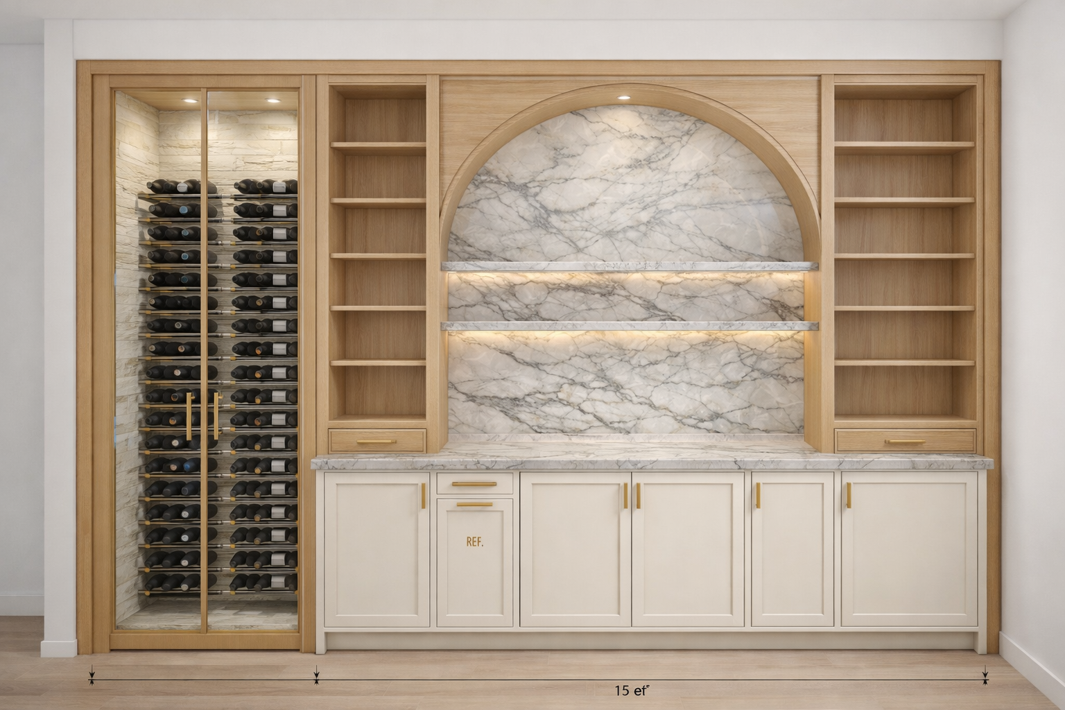 remove the undershelf lighting on the stone shelves in the center and make the height of those shelves 50 of what they are now