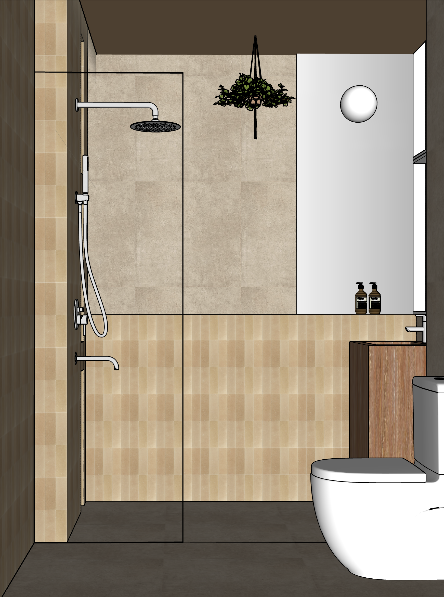 render with the same materials as the sketchup in warm glow add cove lighting on the shower side from false ceiling for the mosaic tiles render with shade variations in every tile add in water droplets on the shower glass there is a mirror with a ball light on it on the right
