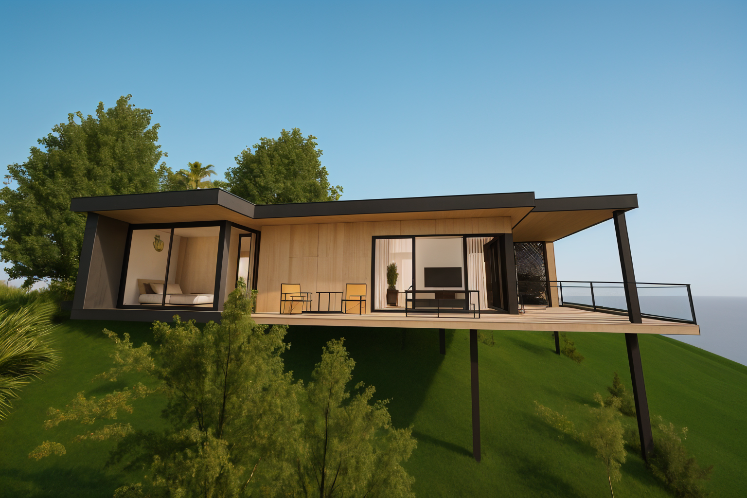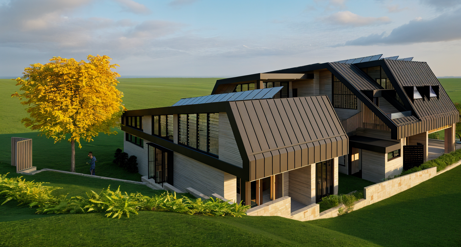 add light atmospheric fog bright and sunny day light coming from a blue sky above a sexy woman facing back wearing jeans walking in front of the house