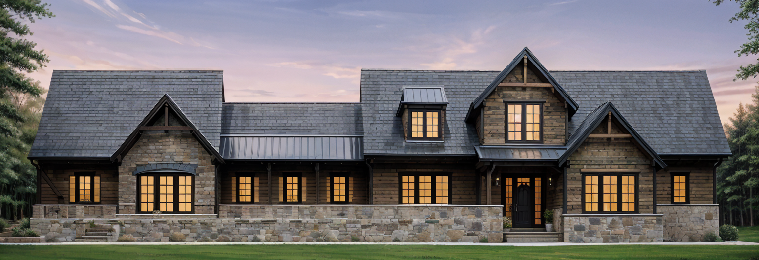 gothic exterior shot black roof dark metal charcoal siding trim cedar wood stained columns doors brackets and a lighter tan stone architecture