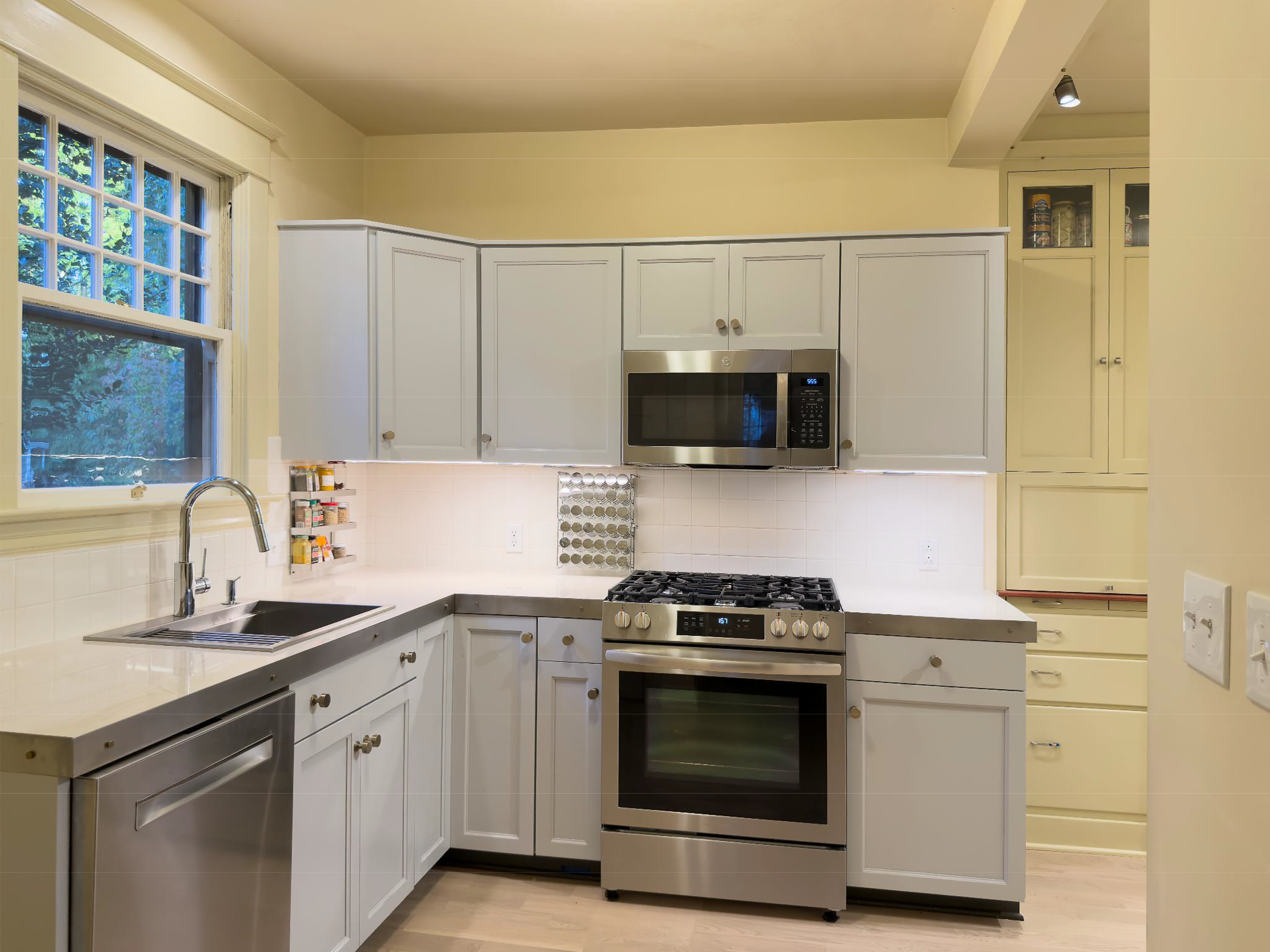 change countertop face band to brass change countertop to veined onyx replace tile backspash with onyx slab maintain cabinet form and change cabinet materials to walnut with vertical grain