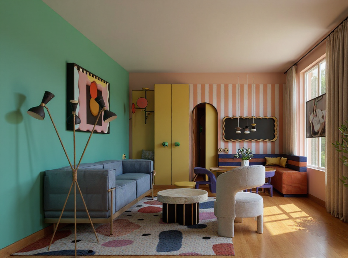 generate a realistic interior in a modern style with bright natural daylight lighting do not change any existing elements or color schemes the furniture should remain semi matte the upper part in a cashmere color with a slight rounding at the end the lower part of the cabinets made of oak veneer the flooring materials remain the same with tiles in the kitchen area as visible in the photo add lighting while maintaining coherence and realism throughout on the ceiling keep the small white flush ceiling fixtures model gx53 grandi ip54 from led hurt https led hurt pl pl p oprawa sufitowa natynkowa gx53 grandi ip54 okragla biala 6690 do not change them the whole should look modern elegant and natural with realistic daylight lighting soft reflections and semi matte surface finishes do not change any lamps and colours they should remain as they are the lamp should be lit and cast the light in the room do not added any lamps add light to ceiling lamps don t added any new light and dont changes the wall colors one the smaller coffe table on the right side should be made of transparent glass