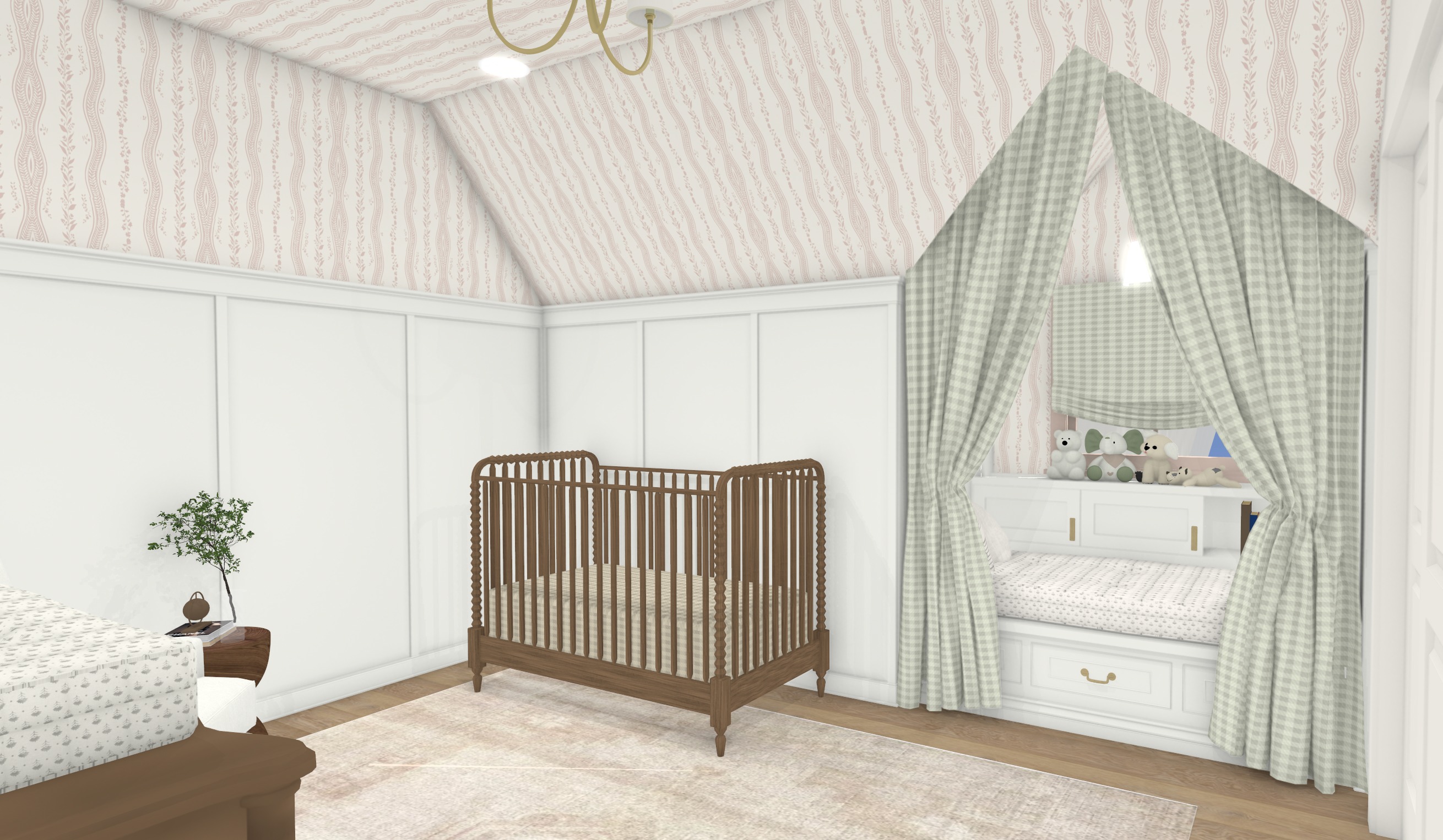 this is a nursery the room should feel light and bright the walls under the wallpaper have a chair rail and millwork detail maintain all colors and textures as shown