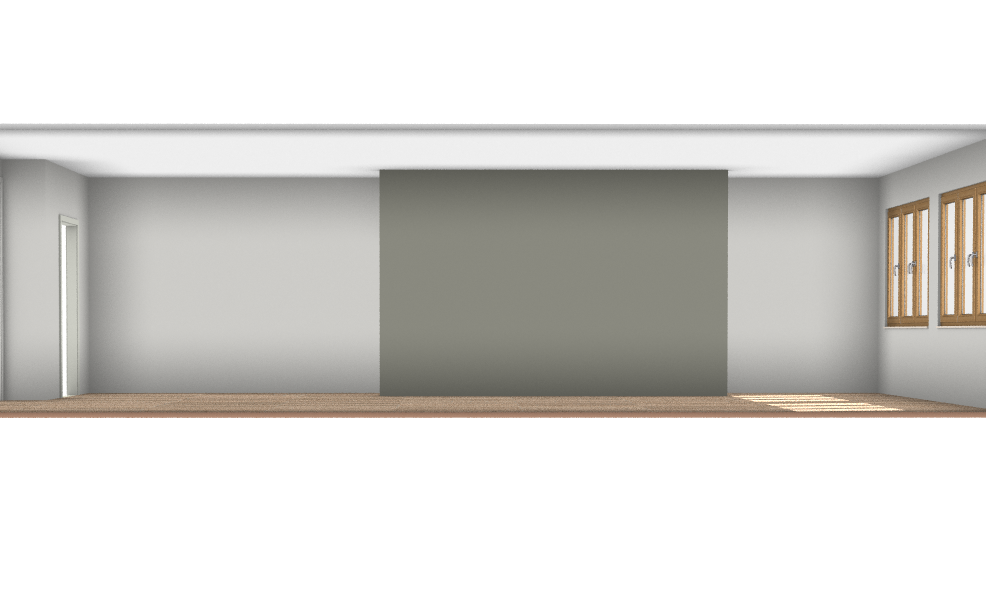 modern scandinavian livingroom with herringbone flooring and luxurious lighting with one concreet green accent wall that hide a staircase behind it for sleeek definition