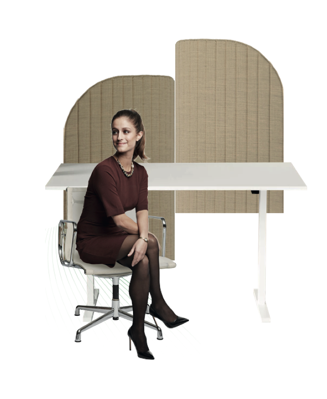 place this desk including the woman and the front screens in an office environment the woman is working on a laptop