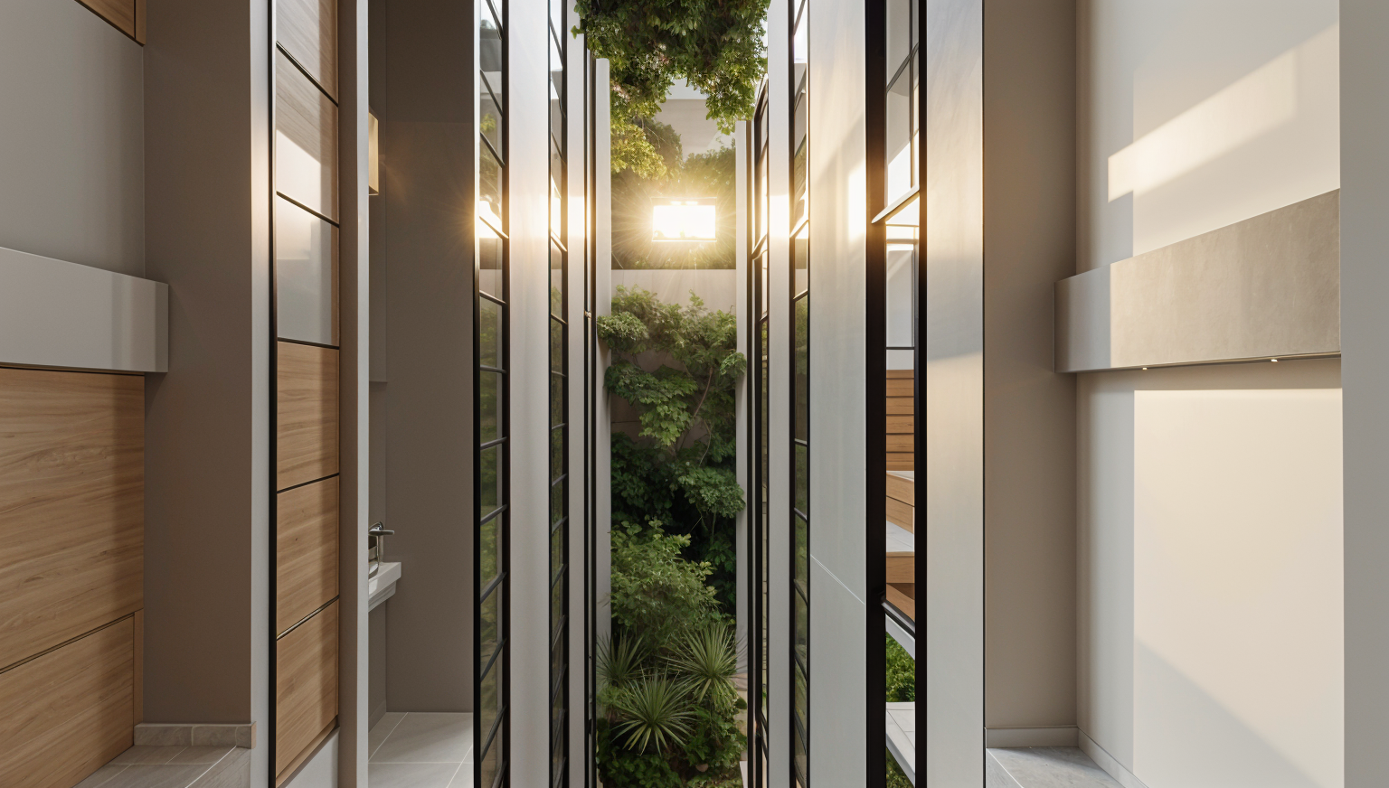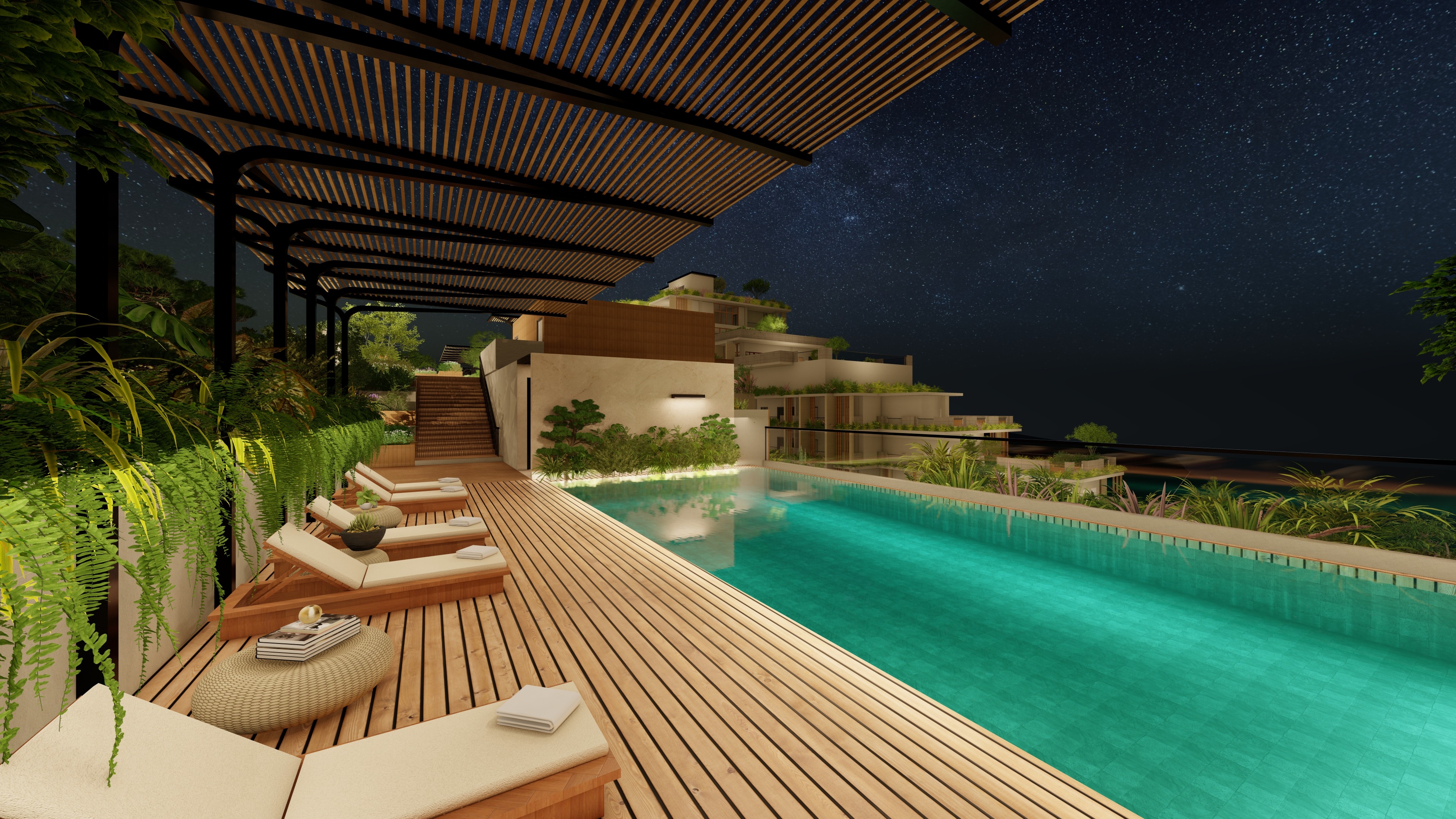night lighting modern contemporary materials in warm gray tones wood nonslip tiles photorealistic 4k resolution 16mm camera lens san mateo rizal valley in the skyline looks like a real estate photograph not a 3d render