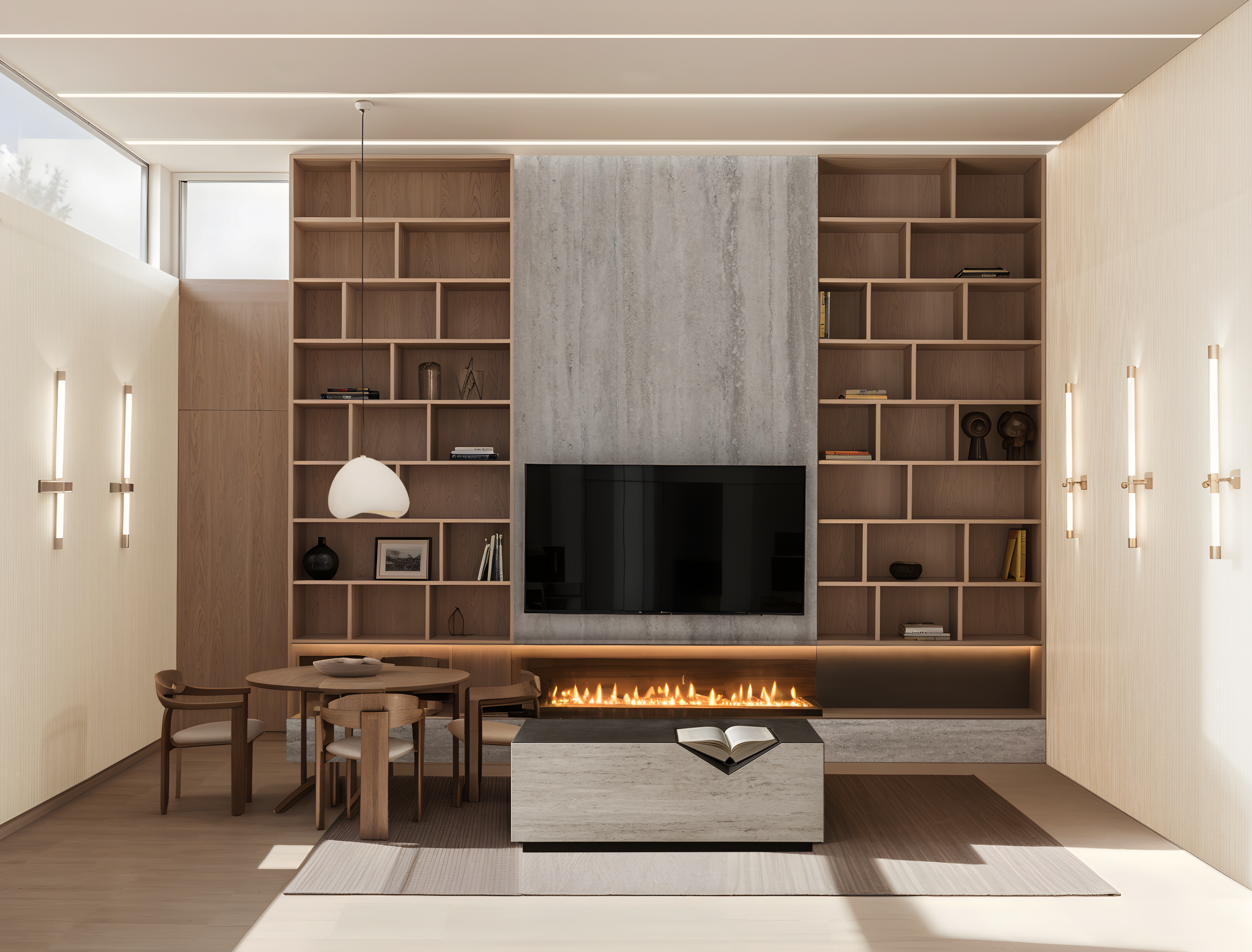 modern living room with a minimalist aesthetic soft natural lighting filters through a large window creating a serene and warm atmosphere the color palette features light beige walls and ceiling with subtle golden accents from wall sconces a central fireplace emits a gentle glow with flickering flames set against a textured concrete panel surrounding the fireplace are built in wooden shelves in a light oak finish elegantly lined with books and decorative piecesand indirect led lighting a round wooden dining table sits in front accompanied by matching chairs with light beige cushions the floor is a smooth light wood leading to a central beige area rug a sleek black flat screen tv complements the contemporary design