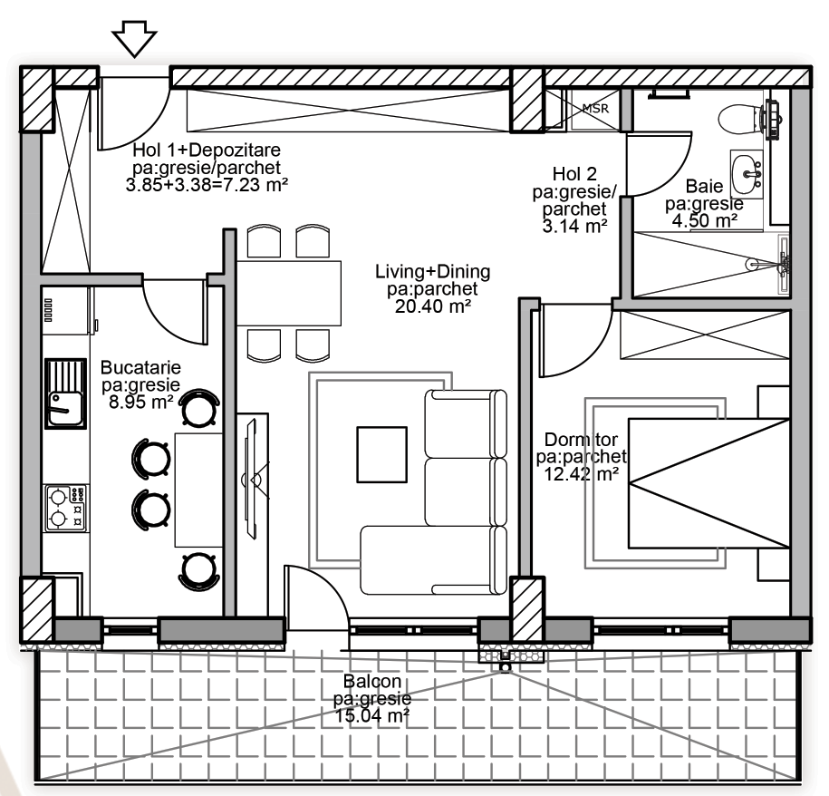 interior from the top genereaza o randare 3d vazuta de sus tip casuta papusii pe jos pune parchet cu aspect de stejar si in baie pe jos ceramica cu aspect de lemn de stejar si pe zona de dus podea pereti ceramica cu aspect de marmura restul obiectelor incerca sa le incadrezi intr un design minimalist cozy cu culori calde crem bej grej care sa arate cam ca cele din schita 2d atasata parchet normal in bucatarie si schimba cuvantul gresie din descrierea bucatariei cu parchet pe terasa te rog sa pui gresie de 60x120cm de culoare gri deschis tot pe terasa e suficienta o zona de masa de cafea cu 2 scaune si pune o bicicleta in locul din dreapta si o minge de fotbal pe jos