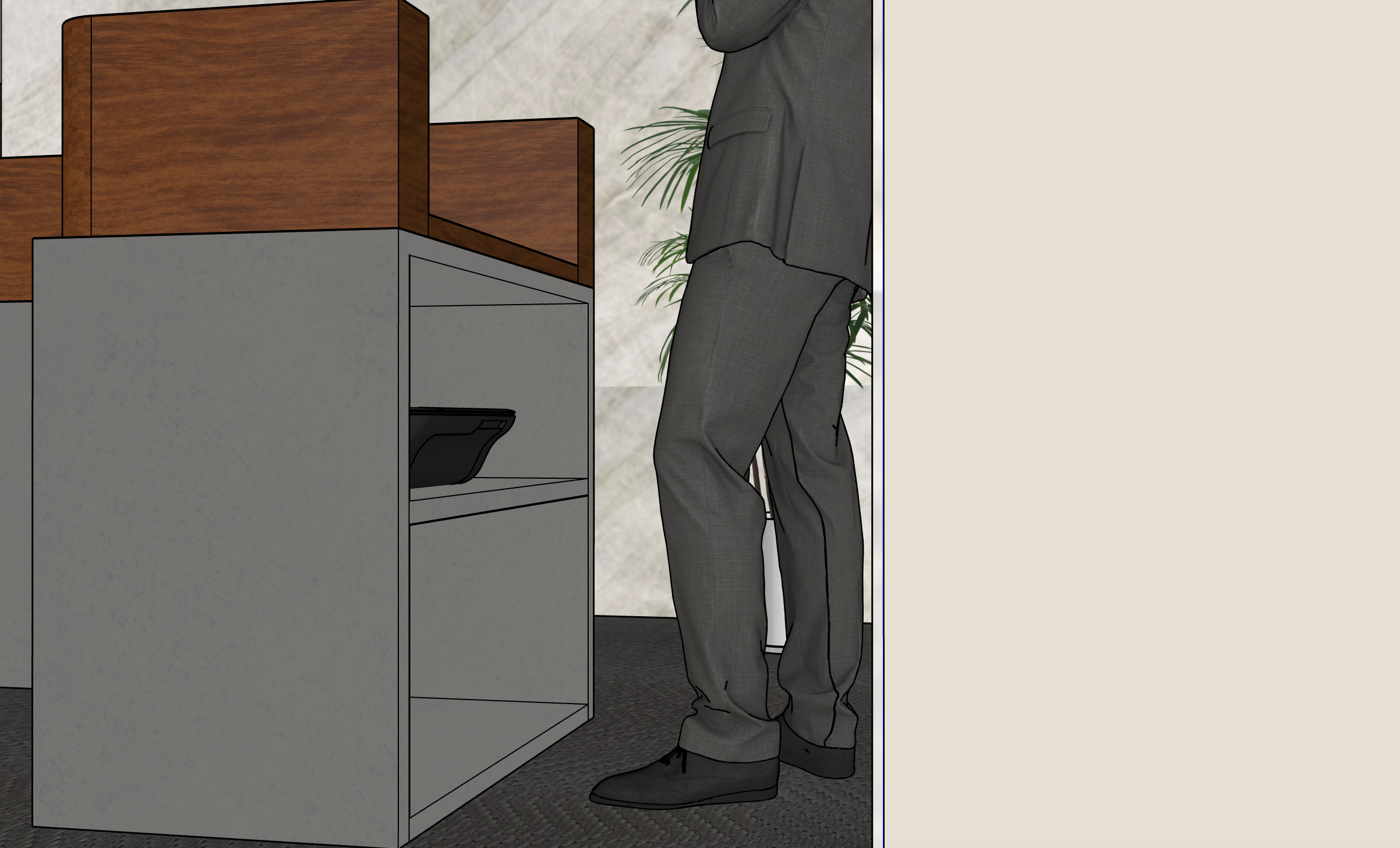 stainless steel pos and the floor is dark gray rug
