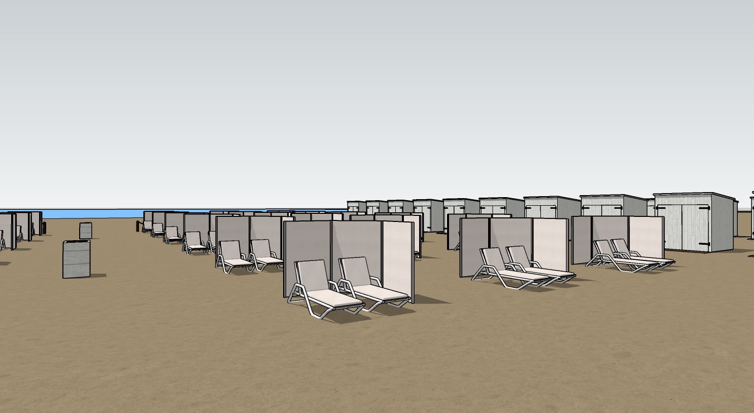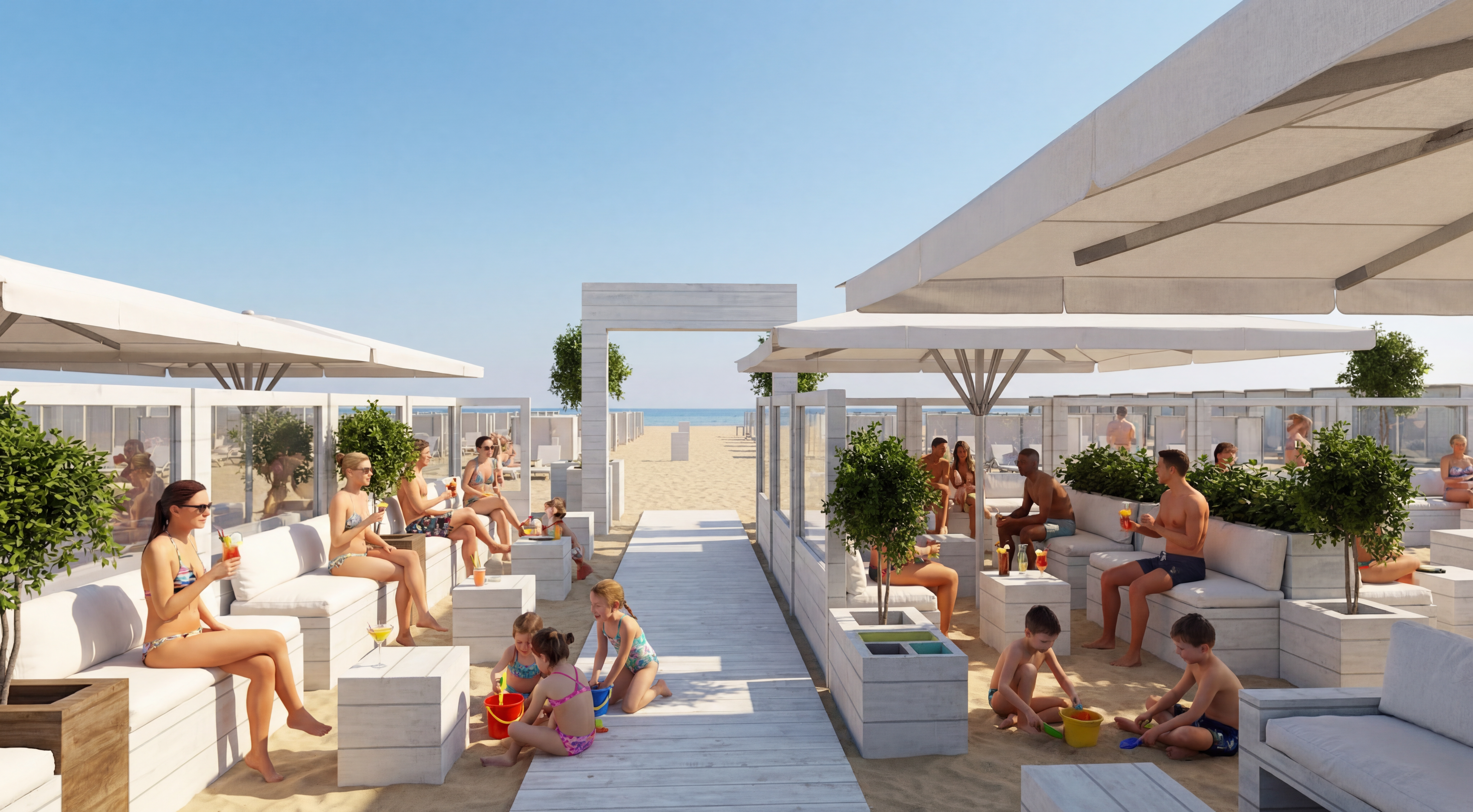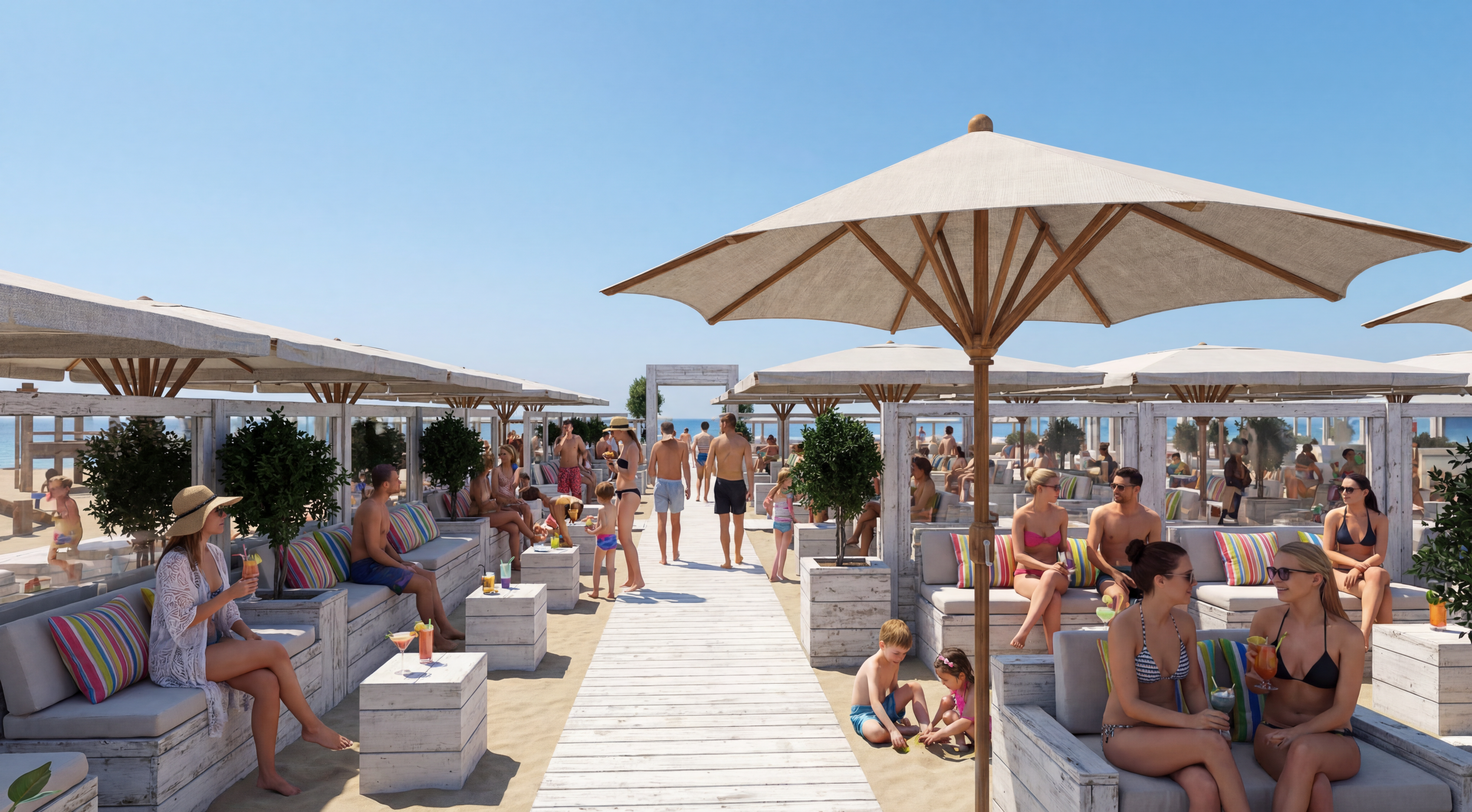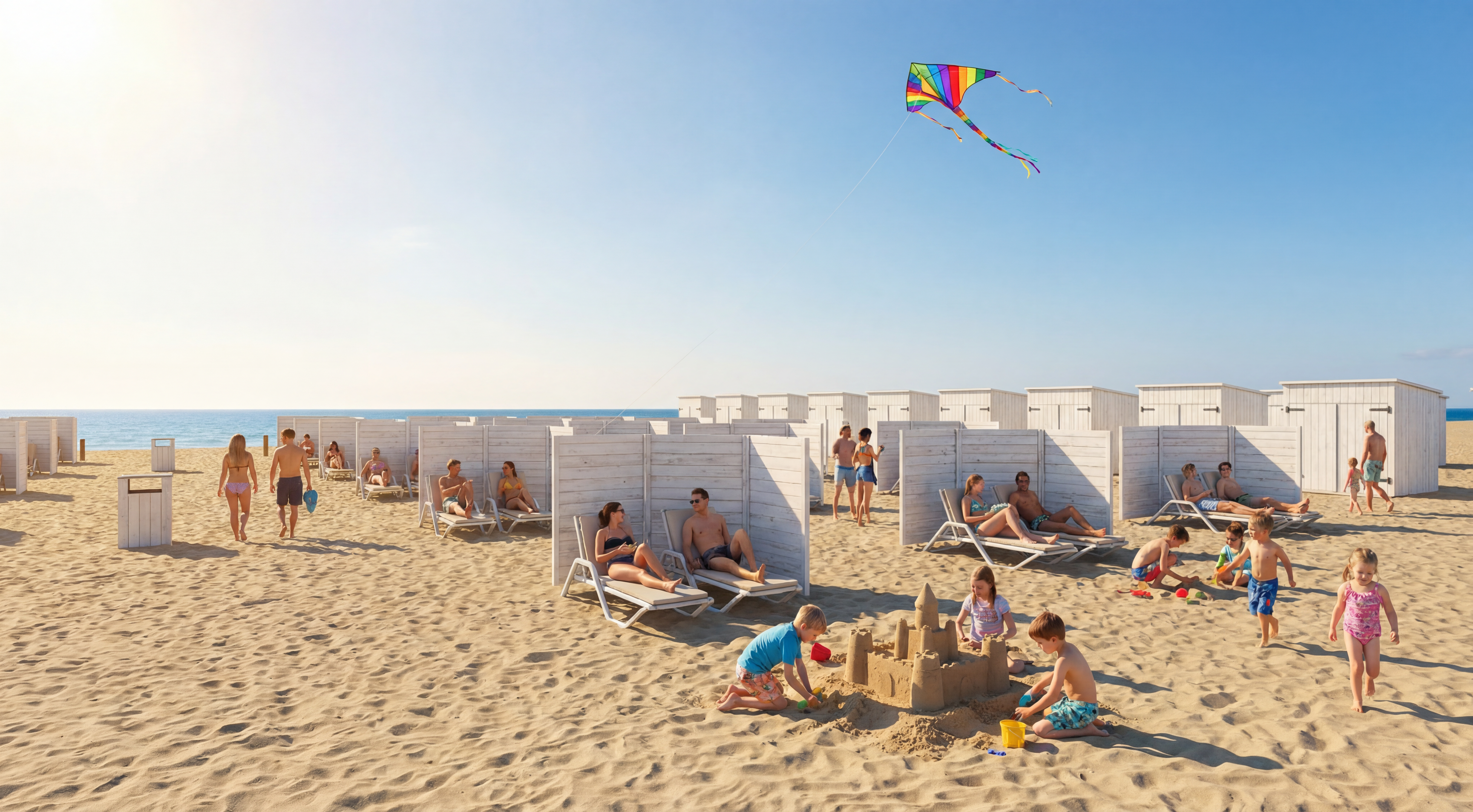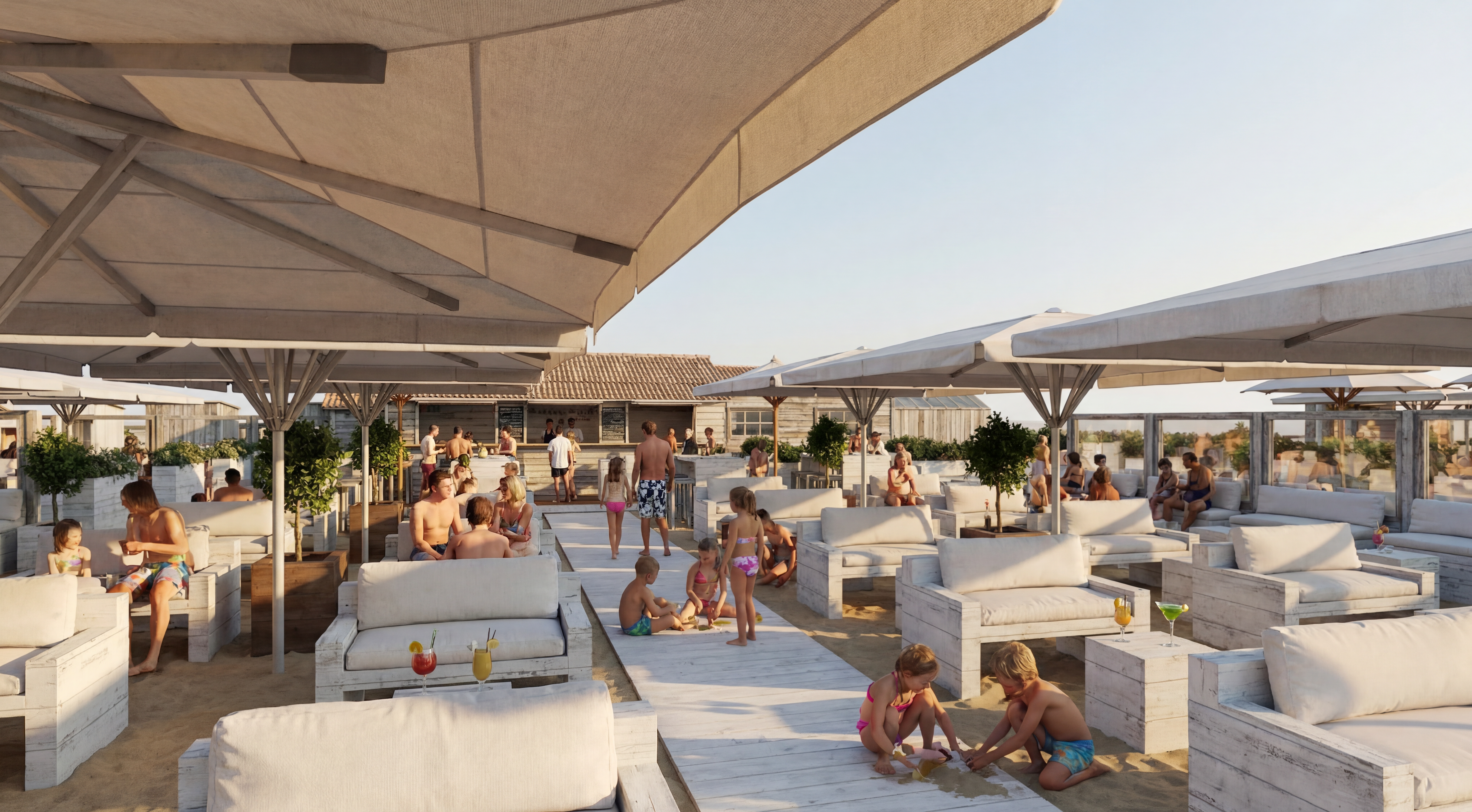 strandbar alles in wit geschilderde planken voeg veel mensen in strandkleding toe alsook zeer veel kinderen die aan het spelen zijn een vlieger in de lucht zandkasteel winschermen uit stof niet uit hout zonnebedden niet in hout maar in creme platiek