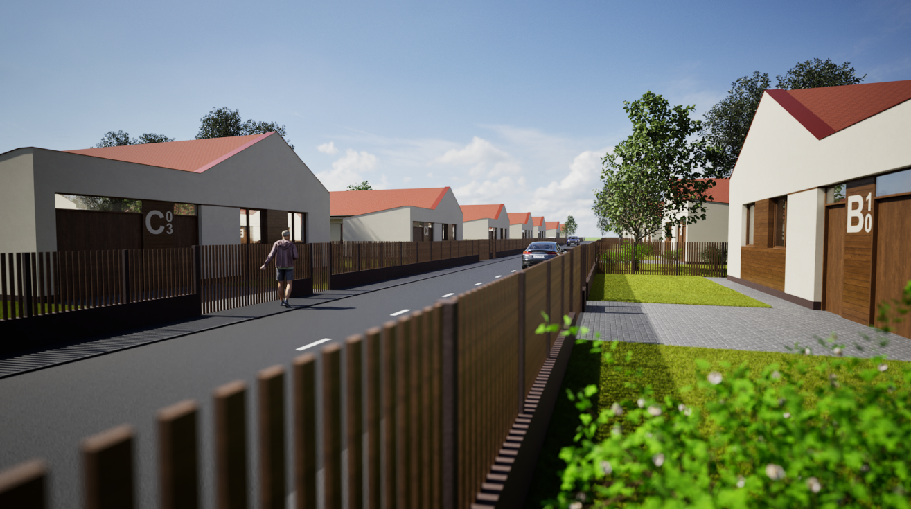 task image to image architectural render goal photorealistic residential street visualization reference image use as base true preserve composition true preserve street layout true preserve building mass true preserve roof geometry true preserve fence alignment true preserve house repetition true strength 80 prompt create a highly photorealistic street level exterior architectural render based on the uploaded reference image a modern residential development with repeating single story detached family houses along a quiet internal street clean minimalist architecture white smooth plaster facades warm wood accent cladding around garage and entrance zones terracotta red pitched gable roofs dark brown vertical metal fencing neat front gardens paved driveways asphalt roadway with subtle lane markings realistic parked cars one or two natural human figures for scale mature trees and soft landscaping bright sunny summer day realistic sky natural daylight physically accurate shadows realistic reflections on glazing premium developer marketing quality believable suburban environment eye level perspective crisp details dslr real estate photography look no redesign of the architecture style type ultra realistic visual quality high detail level very high material realism premium architectural visualization color grading natural balanced slightly warm camera view street level eye height residential masterplan view lens 28mm framing road centered with houses receding into the distance on both sides depth of field subtle mostly sharp across the scene lighting time of day late morning sky clear blue sky with soft white clouds light quality bright natural sunlight shadows soft realistic shadows from trees fences and rooflines exposure balanced with preserved highlights environment season summer vegetation fresh green lawns trimmed shrubs healthy trees setting orderly suburban housing development mood clean modern welcoming premium people and objects keep people minimal true make people realistic true make cars realistic true remove large graphic labels true remove unnecessary text markings true negative prompt cartoon illustration stylized cgi low poly unrealistic houses distorted perspective warped roofs deformed fences blurry foreground excessive depth of field oversaturated colors fake grass unrealistic cars duplicated trees extra buildings floating objects text overlays giant house numbers artifacts low resolution bad shadows fog rain night scene fisheye distortion output aspect ratio 16 9 render intent real estate developer marketing image generation preferences architecture preservation high photorealism priority maximum cleanliness high visual consistency high