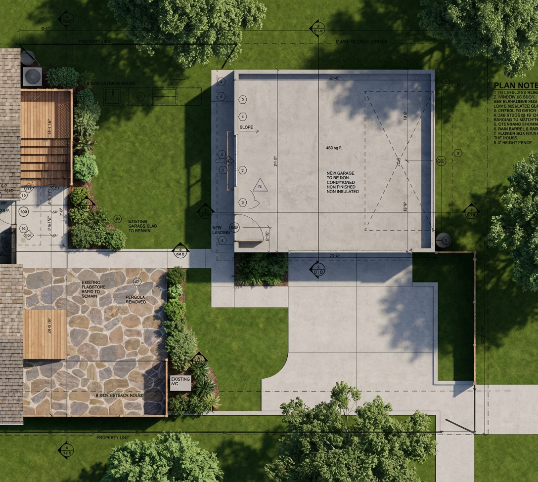 create a realistic image add 2 3 small birds no more in the sky add a men with a kid on a rights side of the picture infront of the garage ad few houses on the background