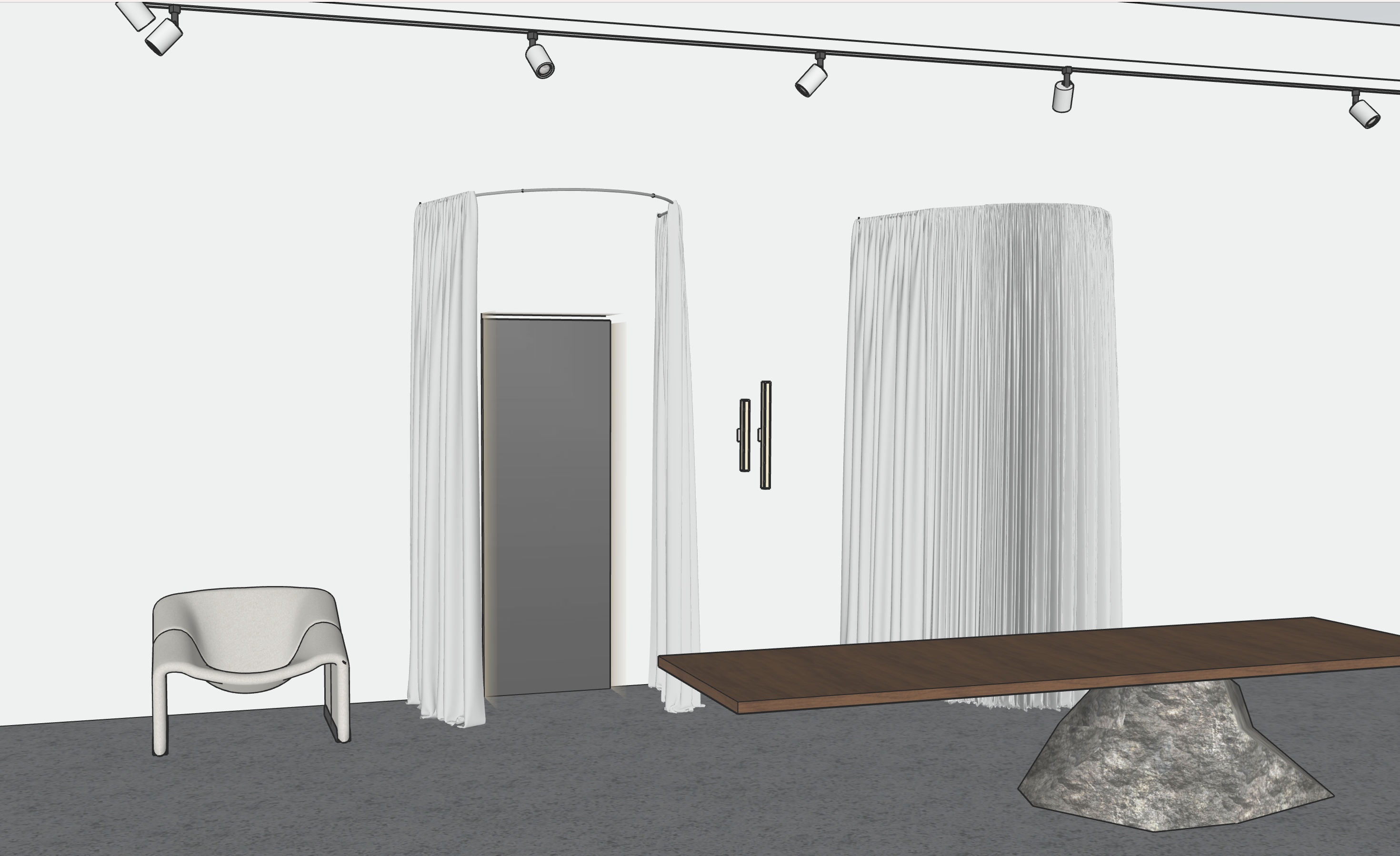 floor is concrete spot rails in ceiling is white the door is a mirror