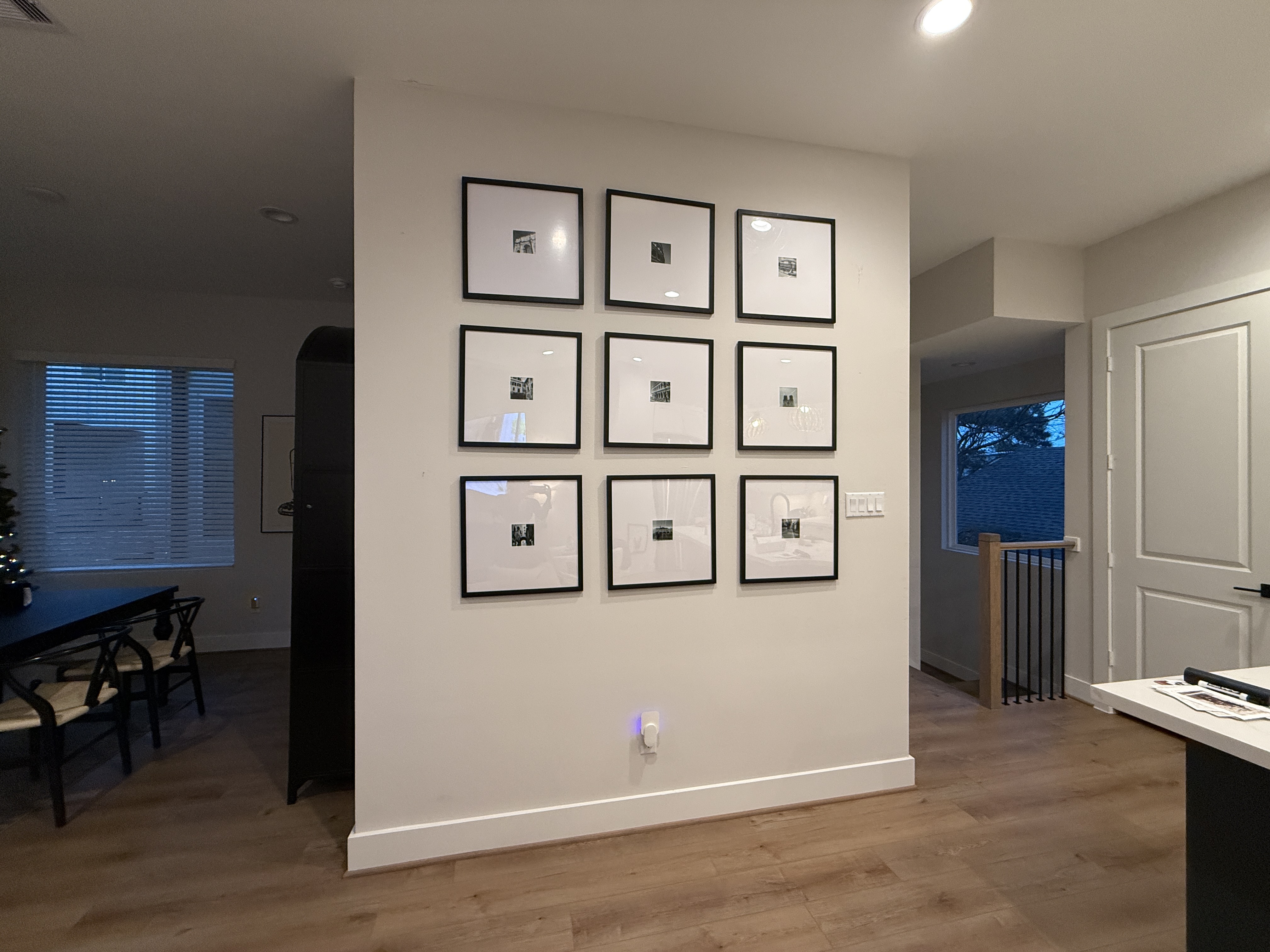 add a styled red carrera marble console table below the gallery wall the table should include two lamps a stack of books and any other stylized elements
