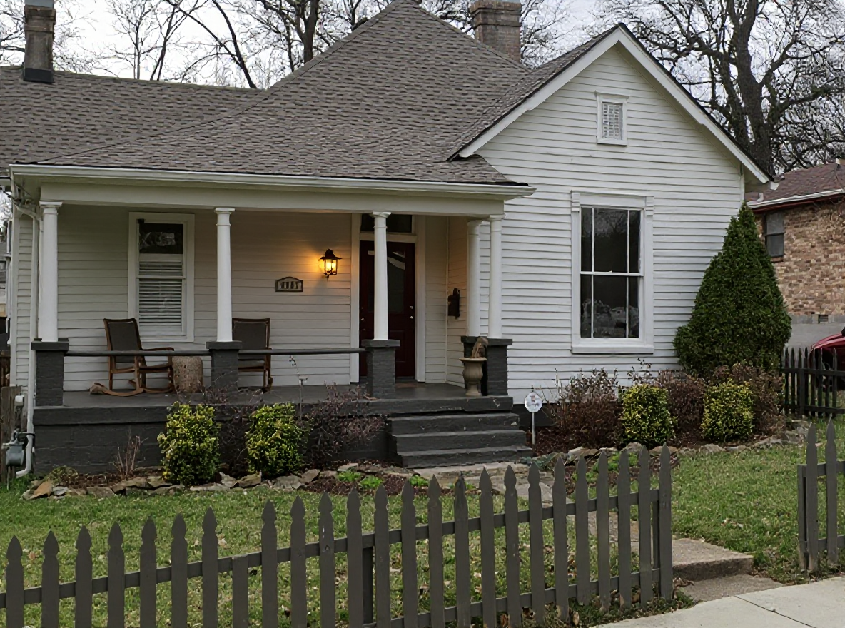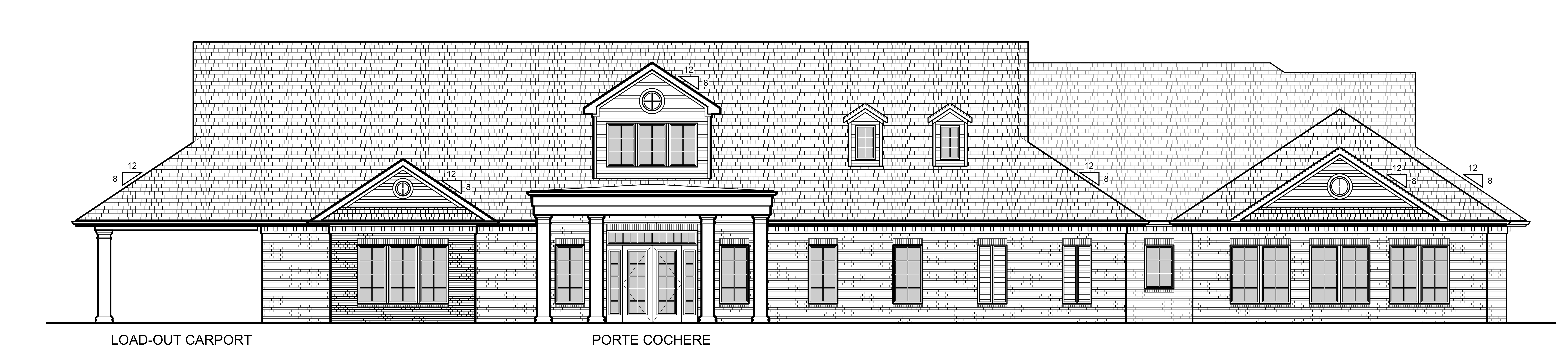 pen and watercoloring rendering charcoal architectural asphalt roofing warm red brick soldier course rowlock course white siding trim windows columns gutters dark bronze downspouts