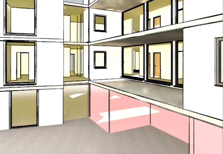 exterior shot this perspective shows a inner courtyard in an care center for elderly where you can see part of the courtyard and also 2 loggias accessible from the wards please render the perspective in a minimalistic manner with wooden and concrete elements suitable for dementia patients