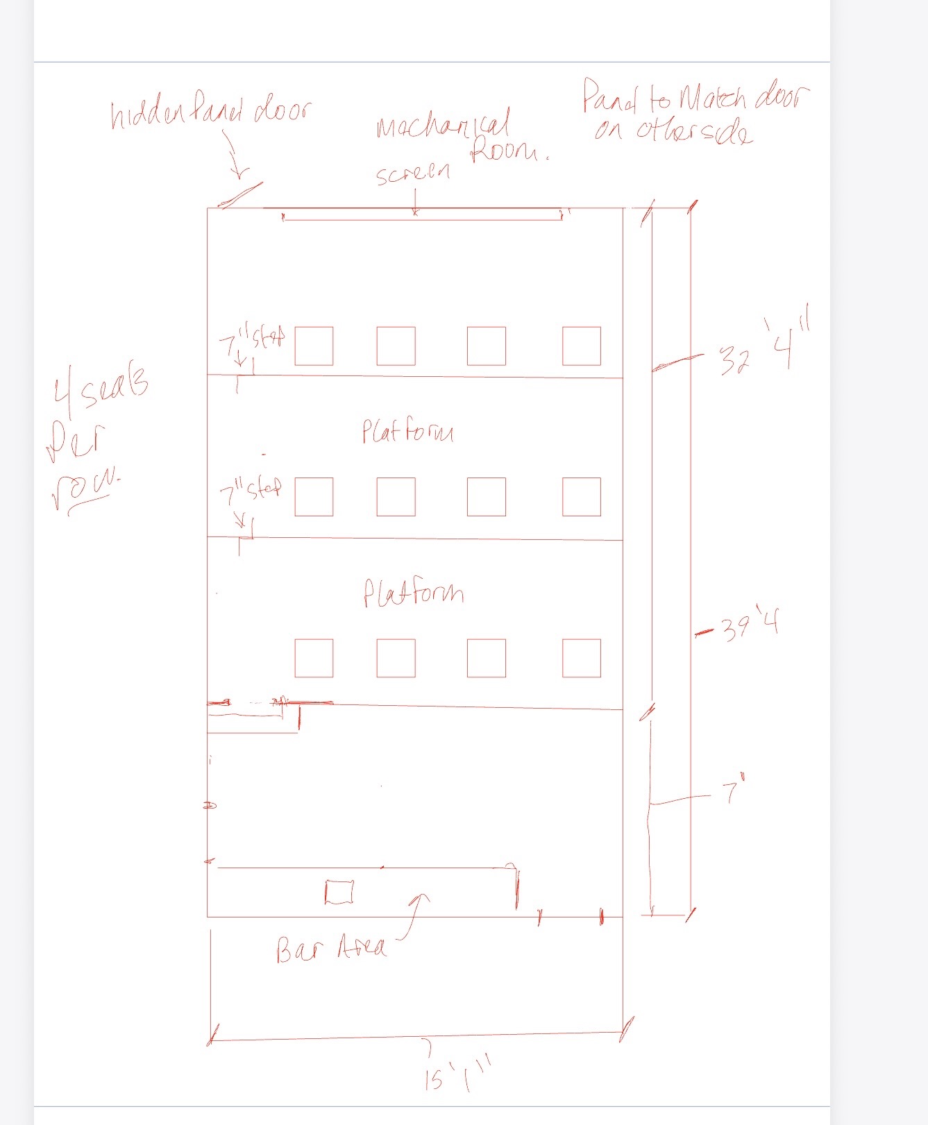 use the uploaded sketched floor plan as the spatial layout reference convert this 2d plan into a photorealistic 3d rendering of a high end residential home theater maintain accurate room proportions based on the sketch include tiered platform seating with two rows 4 luxury reclining theater seats per row raised rear platform with integrated step lighting large projection screen on the front wall built in projector ceiling mounted or concealed in soffit design style refined high end residential not commercial cinema add full height wall drapery curtains along the side walls for acoustic softness and visual richness layered lighting recessed ceiling lights soft cove lighting step lights on risers dark warm color palette deep charcoal navy espresso or rich neutral tones acoustic wall panels integrated subtly behind the drapery plush carpet flooring the room should feel intimate luxurious and tailored similar to a custom buckhead estate theater cinematic lighting with warm ambient glow no commercial signage no concession stand no bright red cinema theme ultra high resolution photorealistic rendering