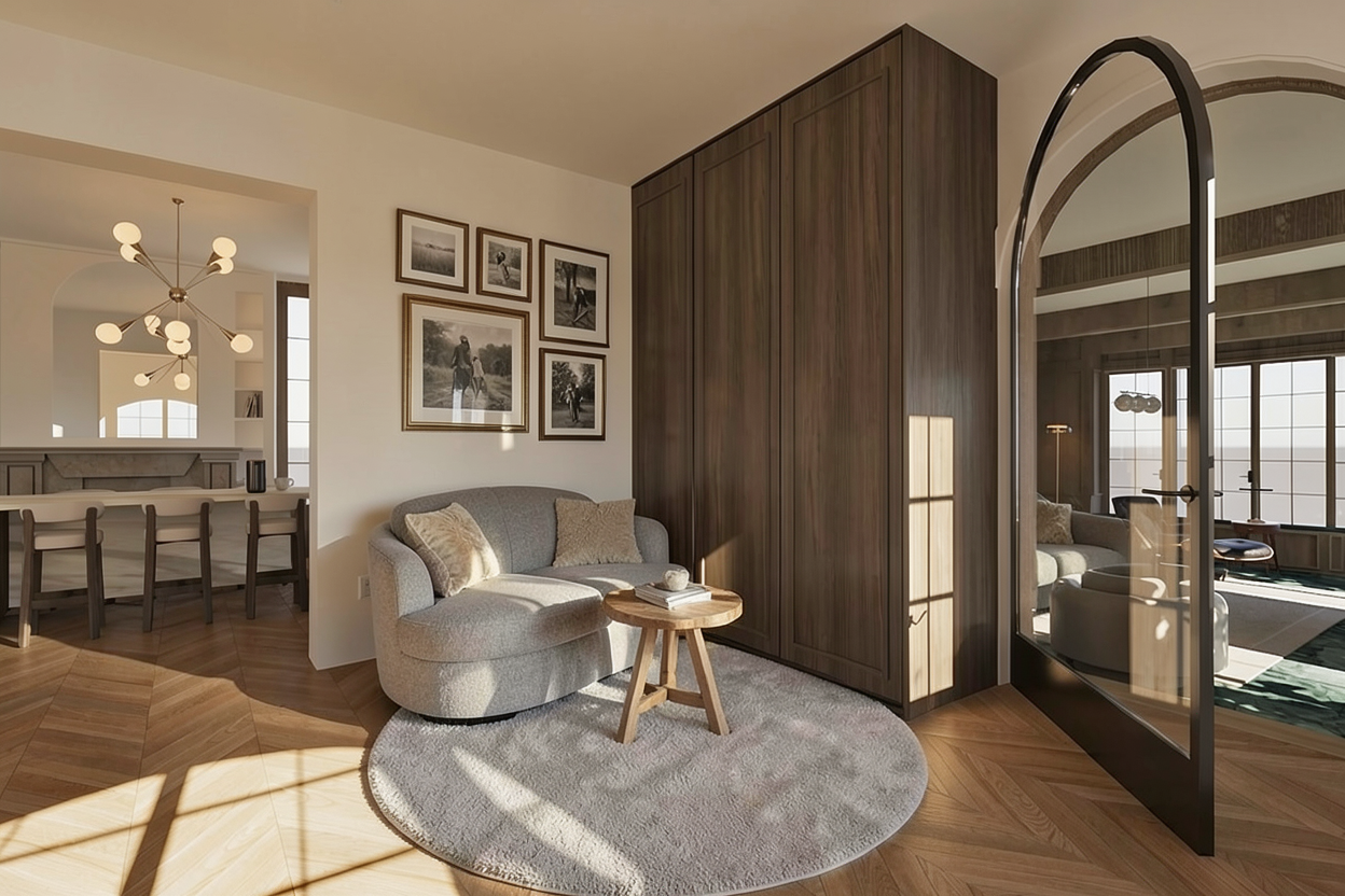 realistic architectural render keep the same tint and color natural light must comme frome the left of the image other windows are interior glasses turn on light fixture and keep global illumination the same as the reference image don t add background in the windows the light fixture must not be transparent replace the plant in the image with more realistic ones