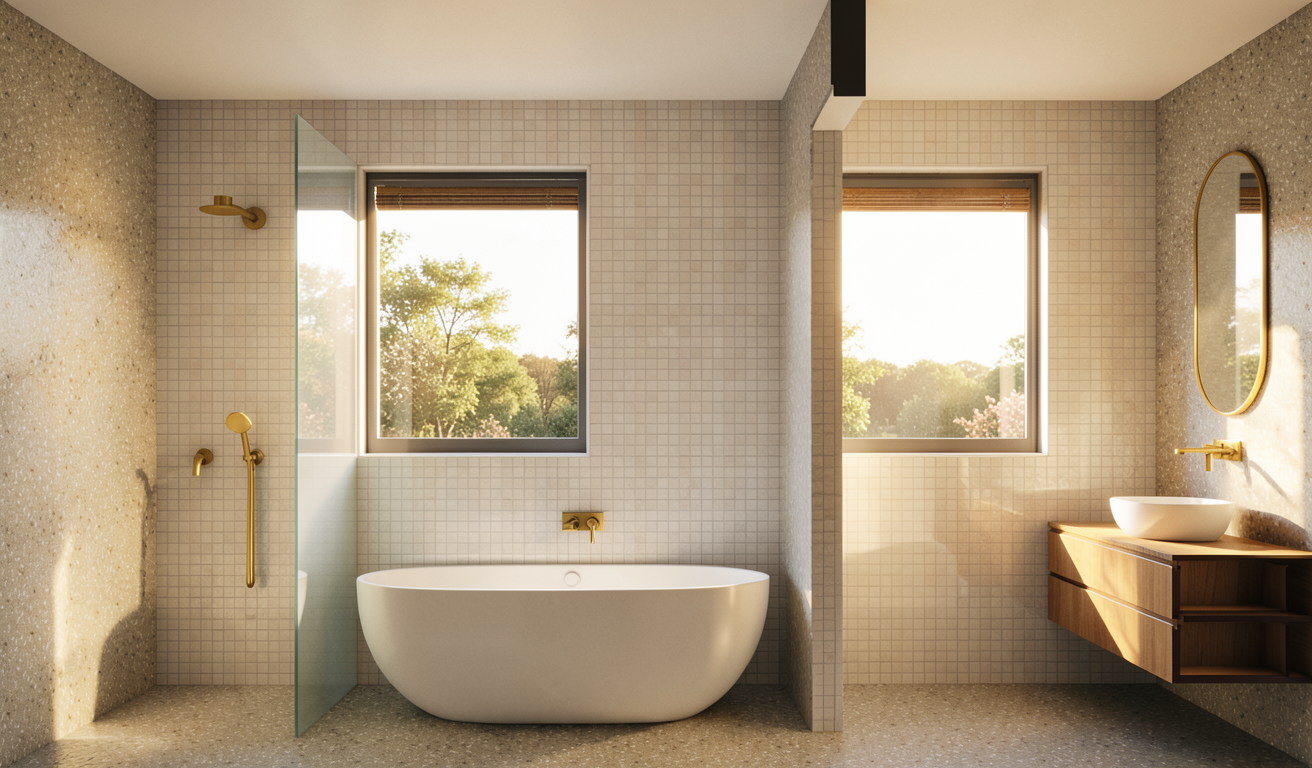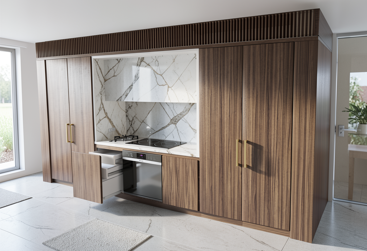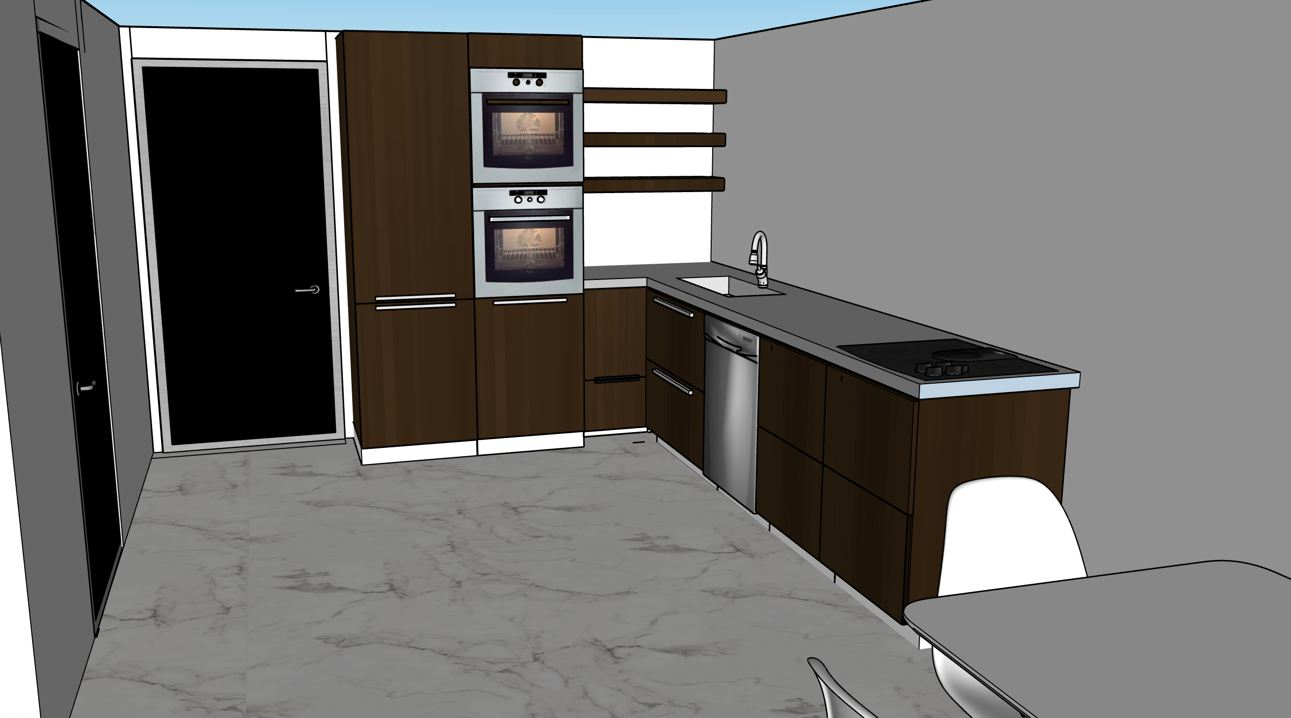 photorealistic interior render based strictly on the provided image and exact geometry preserve the existing kitchen layout cabinet positions appliances proportions and dimensions exactly as shown modern l shaped kitchen with a calm greige color palette matte finishes and subtle natural oak accents flat front base cabinets in warm greige matte finish clean minimalist look induction cooktop with integrated downdraft extractor built into the cooktop no wall mounted hood no ceiling hood no visible ventilation above the counter light warm grey quartz or porcelain countertop matte finish clean straight edges back wall above the right hand countertop finished in a subtle microcement polished plaster look warm greige tone seamless surface matte texture no visible joints or tiles two slim floating oak shelves mounted on the right hand wall above the countertop minimal thickness evenly spaced matching the oak shelves on the left side of the kitchen for visual balance soft warm led strip lighting integrated beneath the oak shelves indirect and subtle creating a horizontal visual line and adding warmth without decoration no upper cabinets no backsplash tiles no patterned surfaces undermount rectangular sink with minimalist matte black or brushed metal faucet built in oven stack remains unchanged integrated dishwasher remains unchanged large format light marble look porcelain floor tiles with warm undertone matte finish as existing walls in soft warm greige smooth finish scandinavian mediterranean modern style calm premium airbnb ready timeless natural daylight entering from the right side warm neutral color temperature soft realistic shadows camera at eye level 60 65 degree field of view no wide angle distortion ultra realistic materials accurate scale natural reflections high realism no people no plants no decor objects no artwork no added furniture no layout changes negative exclude prompt legg dette i negativ feltet hvis archsynth har det no extractor hood no wall hood no ceiling hood no backsplash tiles no marble wall tiles no subway tiles no small tiles no upper cabinets no layout changes no appliance relocation no glossy finishes no dark or black kitchen no props no plants no decor no wide angle distortion