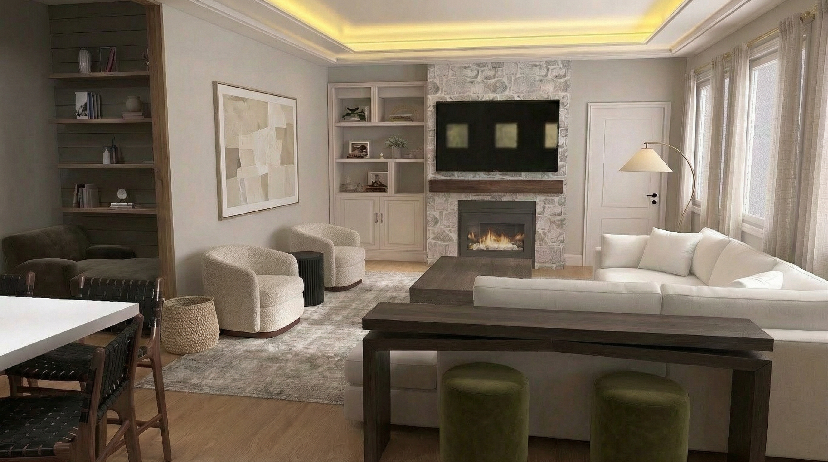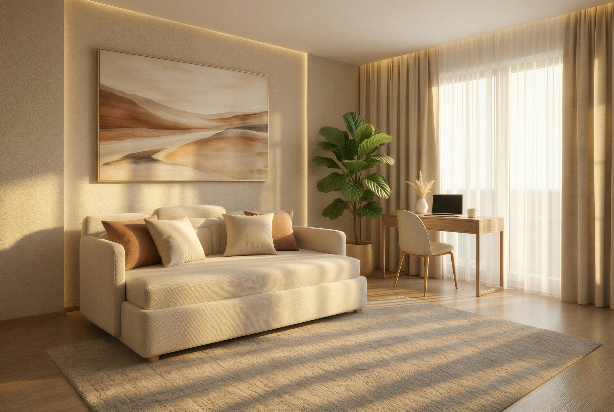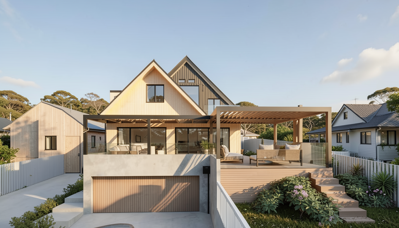 use the provided image as reference critical priorities do not break these rules 1 strictly preserve the exact original structure geometry and volumetry 2 strictly preserve the exact existing colors from the image these two rules override all design decisions do not change building shape rooflines angles or volumes modify proportions in any way move or resize any architectural elements change or reinterpret colors tones or materials colors clean and improve the landscaping remove all clutter and imperfections from the ground add clean well maintained grass add shrubs and simple landscaping elements keep unchanged maintain the exact same treated wood balcony same design position and material keep all windows and doors exactly in the same position and size design task secondary to constraints replace the black panels with vertical black siding same exact black tone use a combination of 2 materials while keeping the same existing colors update the shed cladding to match the house colors replace the main entrance door with a modern glass door without changing opening size design direction modern contemporary clean and minimal goal improve the exterior design without altering volumetry or colors volumetry and color accuracy are more important than design quality