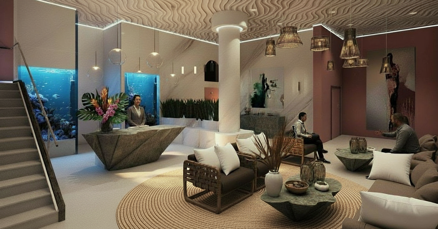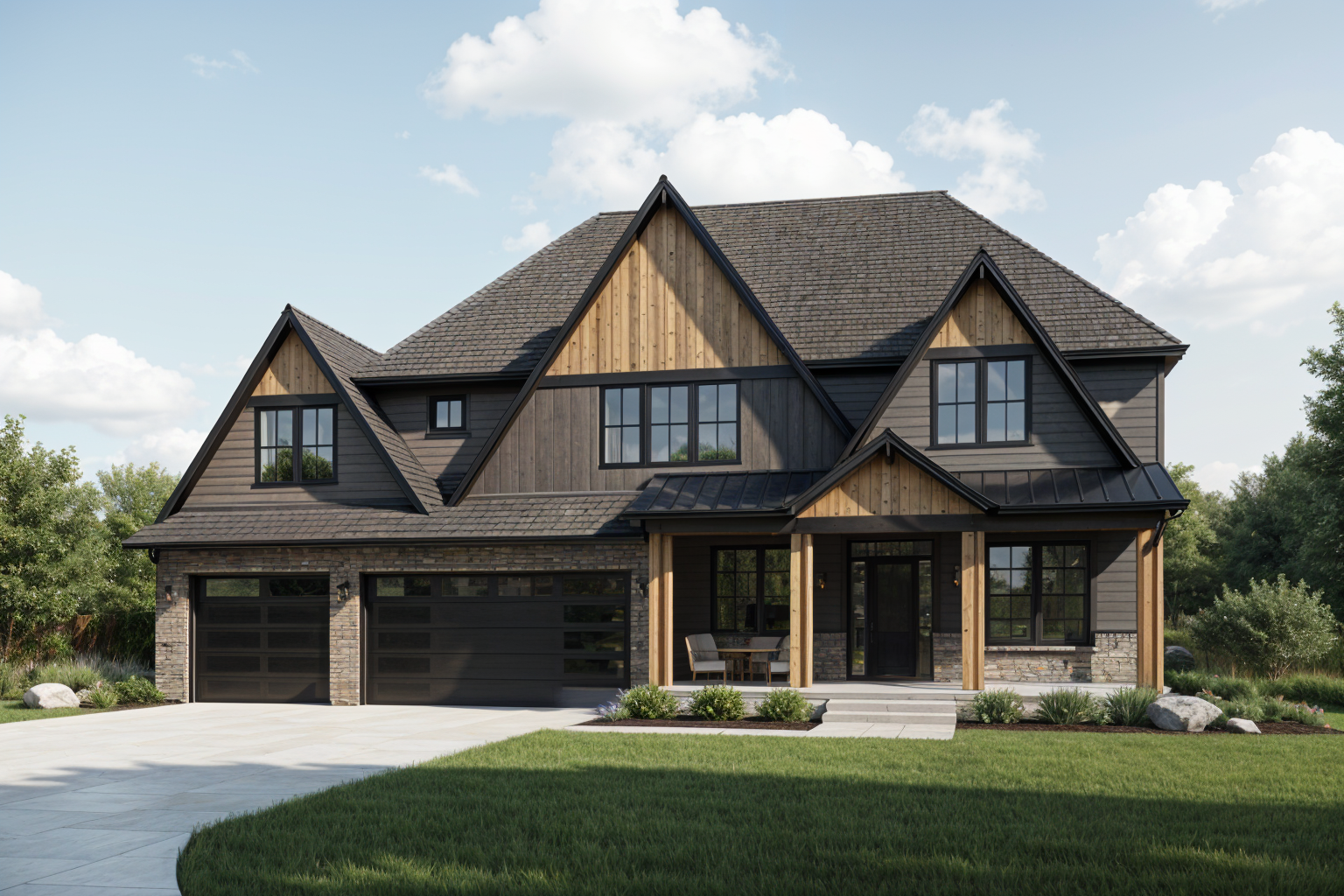 create a high end photorealistic 3d exterior architectural rendering inspired by the reference image design a modern craftsman style two story single family home with multiple steep front facing gables and layered rooflines use a mix of materials including horizontal charcoal gray lap siding warm natural wood accents in the gable ends and porch columns and stone veneer on the lower fa ade and garage surrounds roof should feature architectural asphalt shingles with black standing seam metal accents over the porch include black framed windows large picture windows in the gables and a wide double garage with dark paneled doors front entry should feel welcoming with a covered porch wood posts concrete steps and minimal modern outdoor furniture set the home in a suburban neighborhood with manicured green lawn curved concrete driveway simple modern landscaping with mulch beds small trees and decorative boulders lighting should be natural daylight with soft shadows blue sky with scattered clouds camera angle is a slightly elevated 3 4 front perspective realistic scale crisp materials accurate proportions and true to life textures ultra realistic clean modern architectural visualization quality